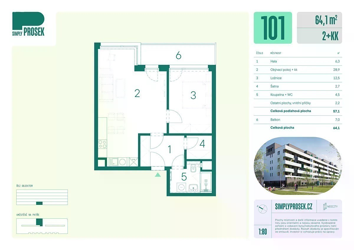 Exkluzivní nabídka bytů 2+kk přímo od developera v nově vznikajícím projektu Simply Prosek. Byt č 101, 2+kk o předpokládané podlahově ploše 57,1 m2 s balkonem o velikosti 7 m2 se bude nacházet v první podlaží domu na adrese Bohušovická. V bytě budou použité nadstandardní materiály: vinylová podlaha, bezfalcové interiérové dveře, bezpečností vstupní dveře, v koupelně zařizovací předměty Ideal standard. V bytě bude rekuperace. V rámci volitelného nadstandardu si můžete dokoupit předokenní elektrické žaluzie, zabezpečení bytu (pouze 1.NP), videotelefon. Na střeše budou umístěny fotovoltaické panely. Vyrobená elektřina se bude využívat na spotřebu společných částí domu. K bytu si můžete dokoupit sklep a parkovací místo. Cena sklepa je od 175 000 Kč v závislosti na velikosti. Cena parkovací místa, které se bude nacházet v prvním nebo druhém podzemním podlaží je 700 000 Kč. Splátkový kalendáře je rozdělený do dvou plateb 15 % a 85 %. První splátka ve výši 15 % je splatná po podpisu Smlouvy o smlouvě budoucí. Doplatek 85 % pak po kolaudaci.