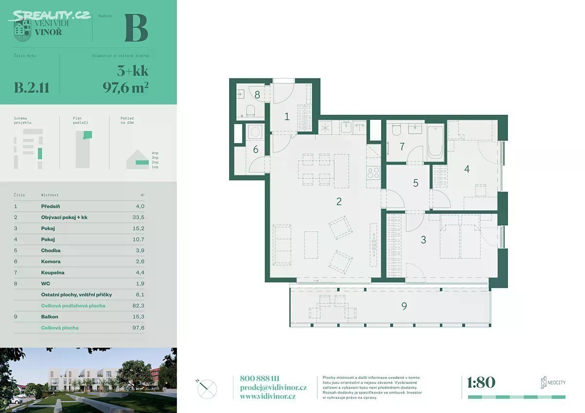 Exkluzivní nabídka bytu 3+kk přímo od developera v nově vznikajícím projektu Veni Vidi Vinoř, jehož výstavba byla zahájena v září 2025. Byt č. B.2.11, 3+kk o předpokládané podlahově ploše 82,3 m2 a balkónu s plochou 15,3 m2 se bude nacházet ve druhém podlaží domu s výtahem. V bytě budou použité nadstandardní materiály: vinylová podlaha, bezfalcové interiérové dveře, bezpečností vstupní dveře, v koupelně zařizovací předměty Ideal standard. V bytě bude rekuperace a podlahové vytápění. V rámci volitelného nadstandardu si můžete dokoupit předokenní elektrické žaluzie. V ceně bytu není zahrnutý sklep a parkovací místo, které je povinnost dokoupit. Cena sklepa je od 125 000 Kč v závislosti na velikosti. Cena parkovacího místa je 580 000 Kč. Sklepy a parkovací stání se budou umístěné v 1.PP. Splátkový kalendáře je rozdělený do dvou plateb 15 % a 85 %. První splátka ve výši 15 % je splatná po podpisu Smlouvy o smlouvě budoucí. Doplatek 85 % pak po kolaudaci. Projekt je jedinečný nejen svojí velkorysostí, kdy na ploše 30 000 m2 se bude nacházet pouze 134 bytových jednotek, ale i propojením s přírodou. V těsné blízkosti je Vinořský park.