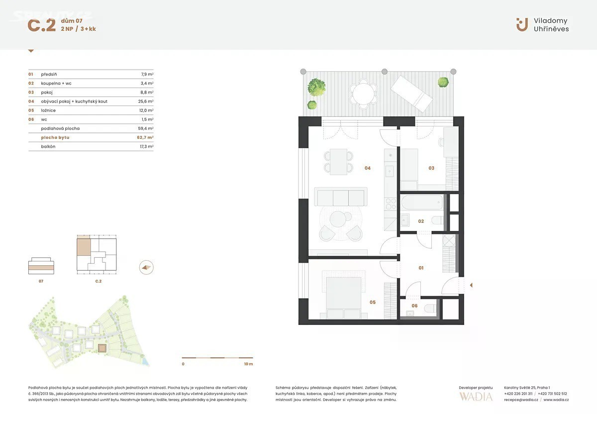 Nabízíme k prodeji byt s dispozicí 3+kk (70,6 m2), balkónem (23,3 m2), s možností sklepa a garážového stání ve 2. nadzemním podlaží budovy s průkazem energetické náročnosti PENB A - mimořádně úsporná. V zeleni mírného jižního svahu vzniká čtvrť čítající 10 komorních bytových domů a 15 parcel pro individuální výstavbu rodinných domů. Důraz na precizní zpracování a promyšlený architektonický koncept činí z Viladomů Uhříněves výjimečnou příležitost pro náročné zájemce o kvalitní bydlení za atraktivní cenu. Hlavními benefity projektu jsou: Fotovoltaické elektrárny na střechách budov Tepelná čerpadla k vytápění a ohřevu vody Rekuperace vzduchu s individuálními jednotkami v každé obytné místnosti Předokenní žaluzie poskytující efektivní exteriérové stínění na všech oknech Podlahové vytápění s lepenou vinylovou podlahou Výška stropu obytných místností 2,75 m Hloubka balkónů 2,2 m Viladomy Uhříněves přinášejí nový standard bydlení, spojují komfort městského života s klidem přírody. Kontaktujte nás a informujte se o dalších přednostech našeho projektu. Parkovací stání a sklep nejsou zahrnuty v ceně bytu.