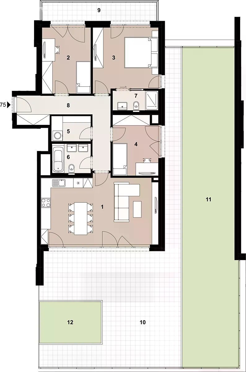 Nabízíme k prodeji byt 218-14-075 s dispozicí 4+kk (92,8 m2), terasou (69,4 m2), předzahrádkou (76,4 m2) a 2x přiřazeným parkovacím stáním v novém projektu Rezidence Jižní terasy na Praze 4 - Hájích. Projekt Rezidence Jižní terasy je přírodou obklopená lokalita v blízkosti největšího pražského přírodního koupaliště. Navazuje na již dokončený rezidenční areál U Hostivařské přehrady a rozsáhlé zelené relaxační plochy, přitom ale leží jen několik minut chůze od metra C - Háje. Přímo v lokalitě vznikne kromě bydlení a bohaté zeleně i nová mateřská škola, dětské hřiště a prostory pro obchody, služby a restaurace. Lokalita nabízí kromě široké občanské vybavenosti i bohaté možnosti sportovního a kulturního vyžití. Zájemci o koupi nového bytu v tomto projektu si mohou zdarma vybírat z desítek kombinací koupelnových obkladů a dlažeb, z mnoha typů a barevných řešení podlah a dveří v naší největší developerské vzorkovně na trhu. Pomůžeme Vám vytvořit designově sladěný domov přesně podle Vašich představ. Parkovací stání a sklepy nejsou zahrnuty v ceně z důvodu snadnějšího a přehlednějšího porovnání napříč nabídkou na trhu nového bydlení.