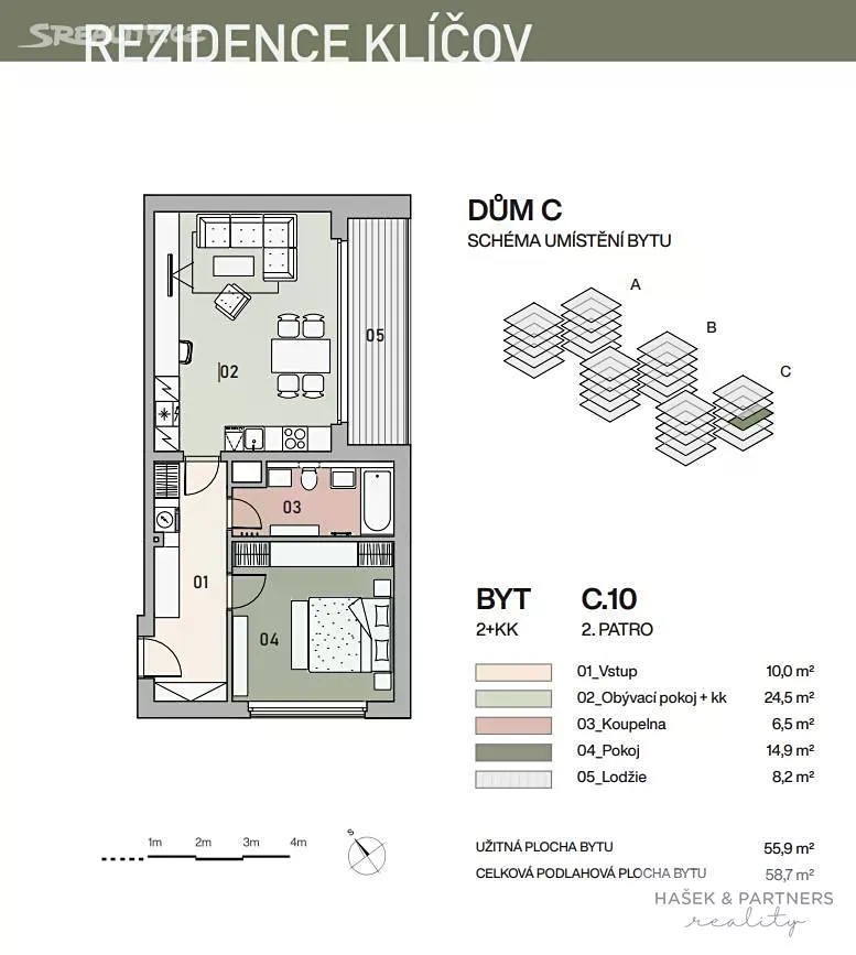 Nabízíme k prodeji, v nově vznikajícím bytovém komplexu rezidence Klíčov ve Vysočanech byt o dispozici 2+kk o velikosti 58,7m2 a Lodžie o velikosti 8,2m2, nacházející se ve 2.patře budovy C. Orientace bytu na J/V. Celý komplex bude mít celkem 54 bytových jednotek rozdělených do tří, vícepatrových budov. Lokalita v klidné části Vysočan na území bývalých viničních usedlostí Klíčov a Krocínka v blízkosti zeleně a zároveň s velmi dobrou občanskou vybaveností a dopravní dostupností do centra města. V blízkosti je stanice metra B Vysočanská, autobusová zastávka směr do Kobylis, na Českomoravskou, Prosek, Střížkov, Skalku, Opatov, Chodov a do dalších. Pár minut jízdy také nájezdy na dálnice D8 a D10. V blízkosti se nachází nákupní centrum Fénix a Galerie Harfa, škola, školka, pošta, poliklinika, sportovní hala O2 Arena. Cena bytu je uvedena včetně DPH a nezahrnuje sklepní kóji. Pro více informací a kompletní nabídku bytů nás neváhejte kontaktovat. Dokončení projektu je plánováno koncem roku 2025.