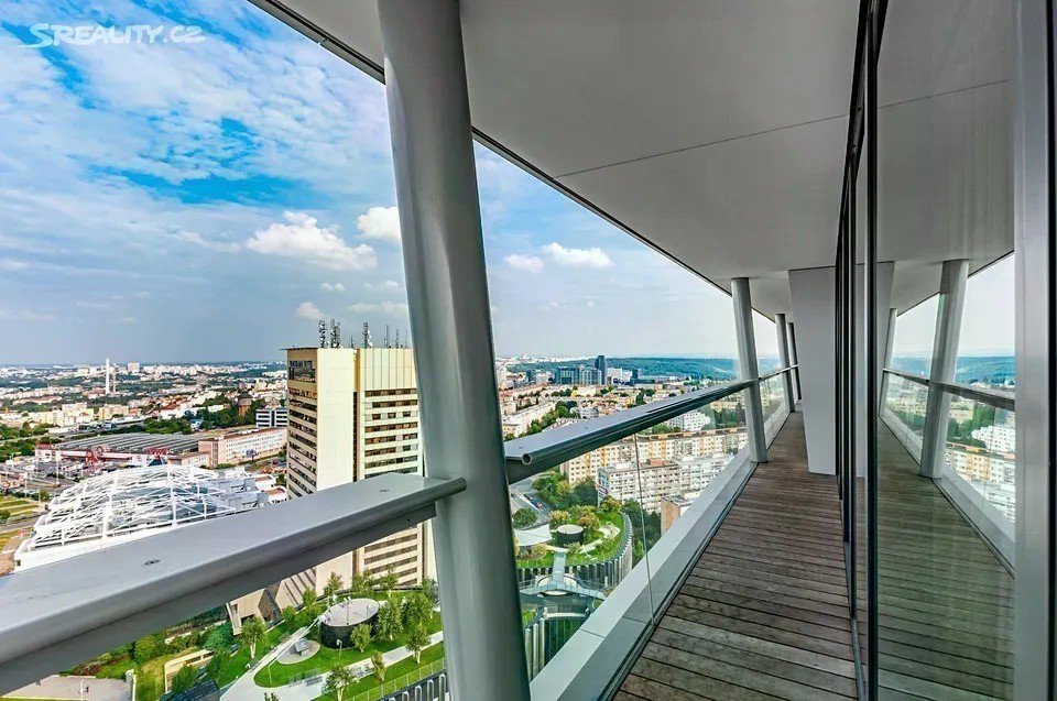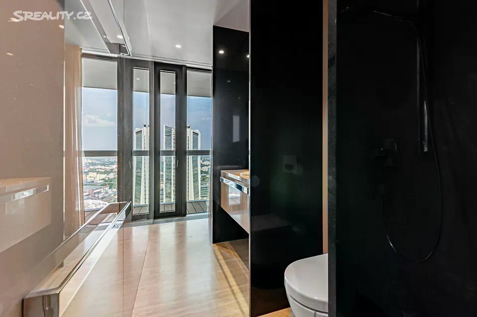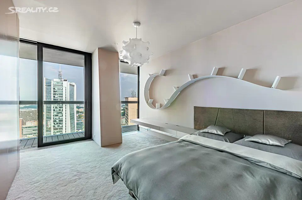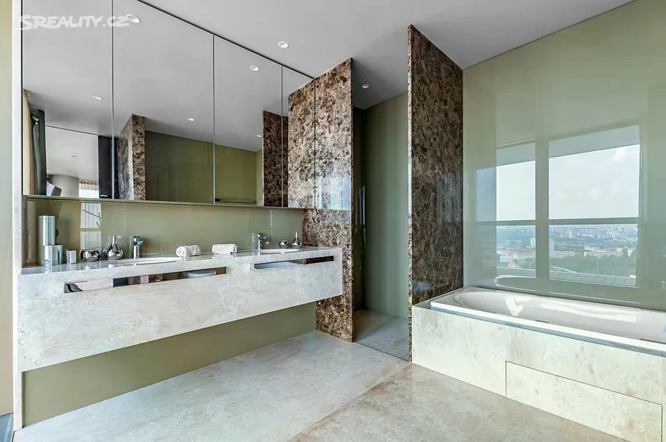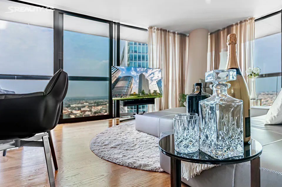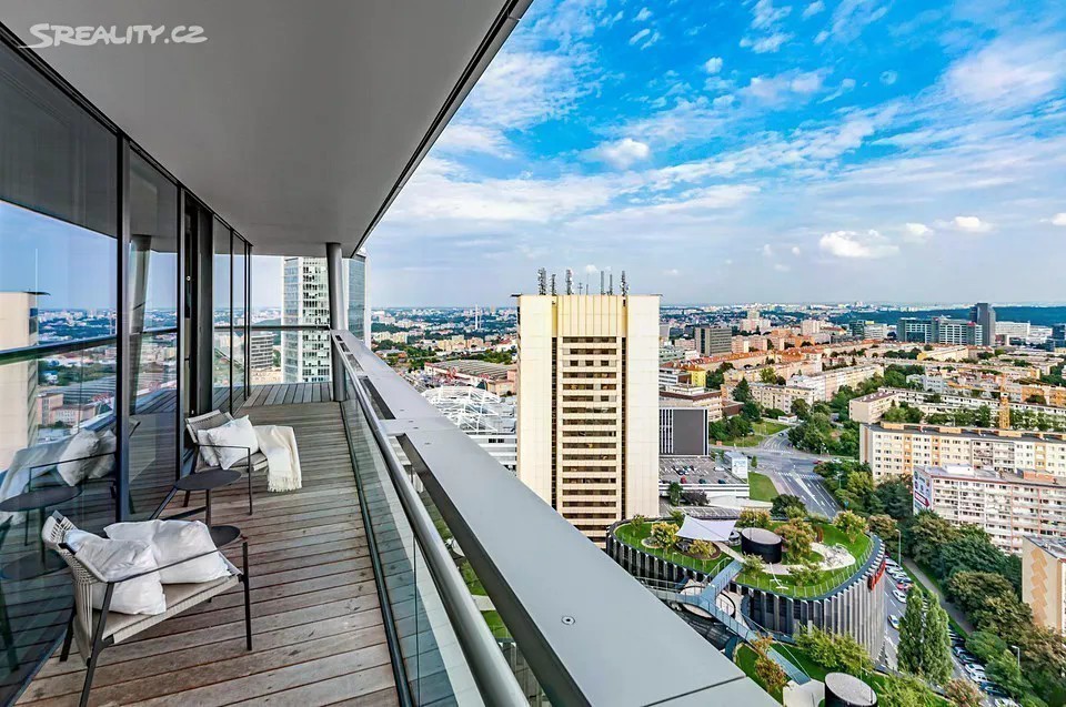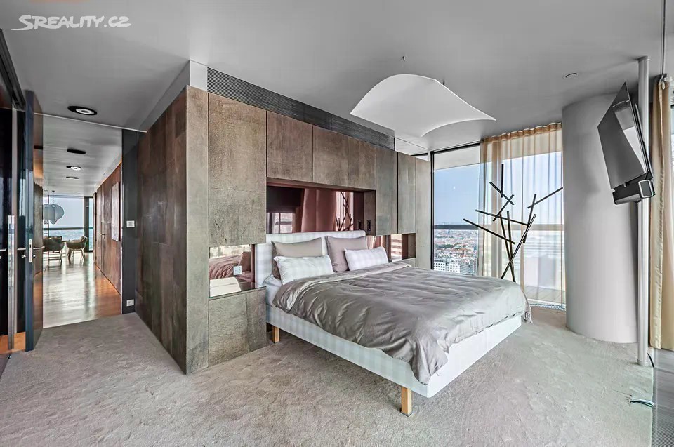Prodej reprezentativního, luxusního, jihozápadně orientovaného bytu 4+kk (197 m2) s terasou a neopakovatelnými výhledy na Pražský Hrad, lemující celý byt s dvěma parkovacími místy a dvěma sklepy ve 24. podlaží západní věže projektu V Tower, ve třiceti patrovém 104 metrů vysokém mrakodrapu na Pankrácké pláni v Praze 4, severovýchodně od křižovatky ulic Pujmanové a Milevské, na hranici Krče a Nuslí. Budova V Tower v Praze je budova se špičkovými, nadčasovými technologiemi a luxusními materiály a zároveň ukázkovým designem s nadstandardními službami pro ty nejnáročnější rezidenty. Samozřejmostí pro rezidenty je privátní fitness, sauna, pára a bazén, privátní kino a klubové patro, golfový trenažér pro relaxaci, rychlo-dobíjecí stanice pro elektromobily. Servis 24 hodinové recepce a služby na úrovni světových luxusních rezidenčních projektů, která nemá ve střední Evropě konkurenci. Concierge službami, které pomáhají zajišťovat drobnosti jako zalévání květin, úklid či venčení domácích mazlíčků, přebírání důležité poštovní zásilky, informace, která restaurace stojí za návštěvu nebo jakou hru shlédnout v Národním divadle. Dispozice bytu 4+kk zahrnuje vstupní halu, otevřený, velkorysý prostor obývacího pokoje s přímým vstupem na terasu, samostatná kuchyň v bílém designu, dále dvě oddělené ložnice s terasou, hlavní ložnice, dvě koupelny, první koupelna (vana, sprchový kout, toaleta, bidet), druhá koupelna se sprchovým koutem, další dvě samostatné toalety, dostatečné množství úložných prostor, na míru zhotovená šatna. Celý byt lemuje fantastická terasa s neopakovatelnými výhledy, přístupná ze všech pokojů a koupelny v bytě. Vybavení zahrnuje kompletně vybavenou kuchyňskou linku Hanák v bílém lesklém designu s vestavěnými spotřebiči Miele včetně vinotéky, vestavěné šatní skříně Poggenpohl. Luxusní dřevěné podlahy v obývacím pokoji s kuchyní, v ložnicích koberce, v koupelnách carrarský mramor, velkoformátová dlažba v dekoru mědi a zařizovací předměty značky Villeroy & Boch. Osvětlení v celém bytě a exteriérové žaluzie na dálkové ovládání, plus klimatizace. Kupní cena zahrnuje kompletní vybavení dle fotografií, dvě parkovací místa a dva sklepy umístěný v 1. podzemním podlaží domu s výtahem. Zajímavá investiční příležitost zajišťující dlouhodobě stabilní výnos, vzhledem k silné poptávce po nájemních bytech pro zahraniční a českou klientelu v této žádané a ojedinělé budově s concierge službami v Praze. Energetická náročnost budovy: B