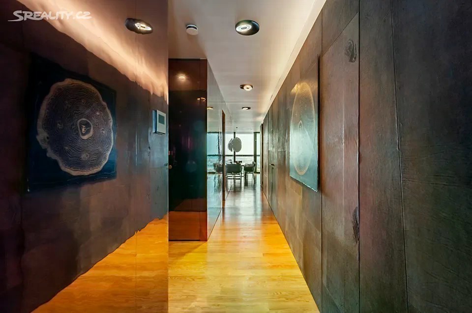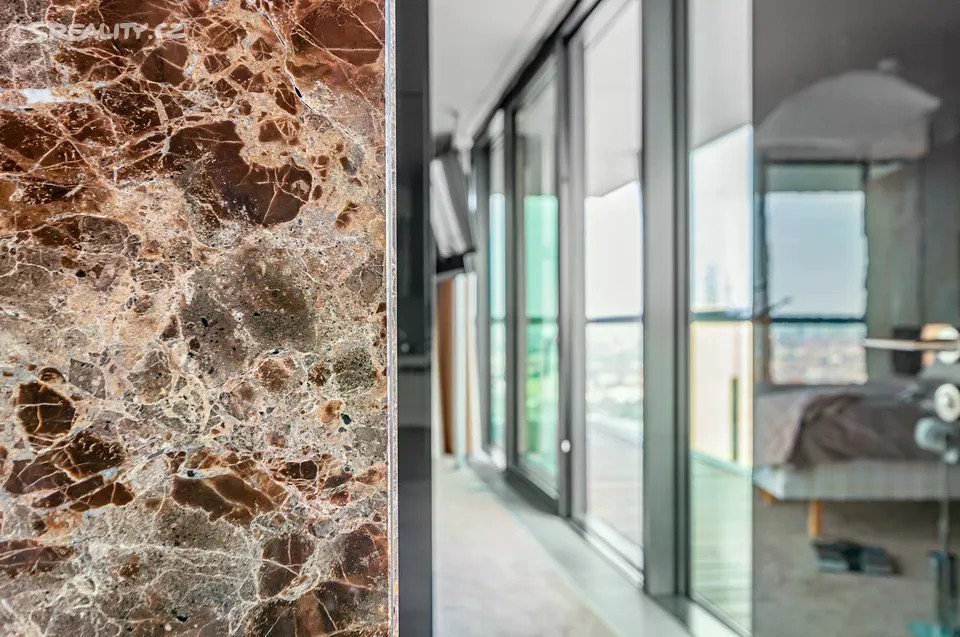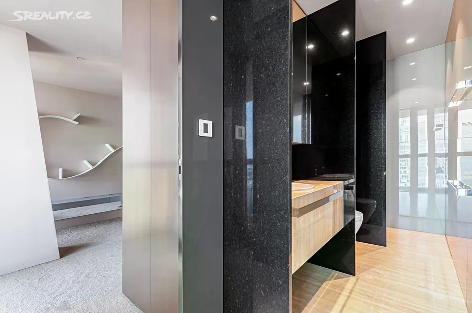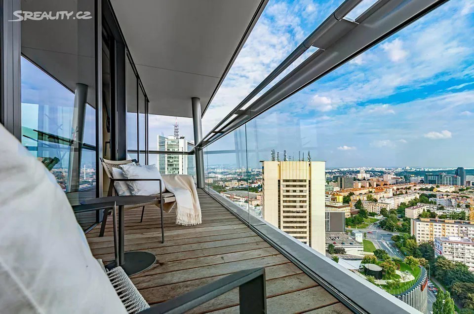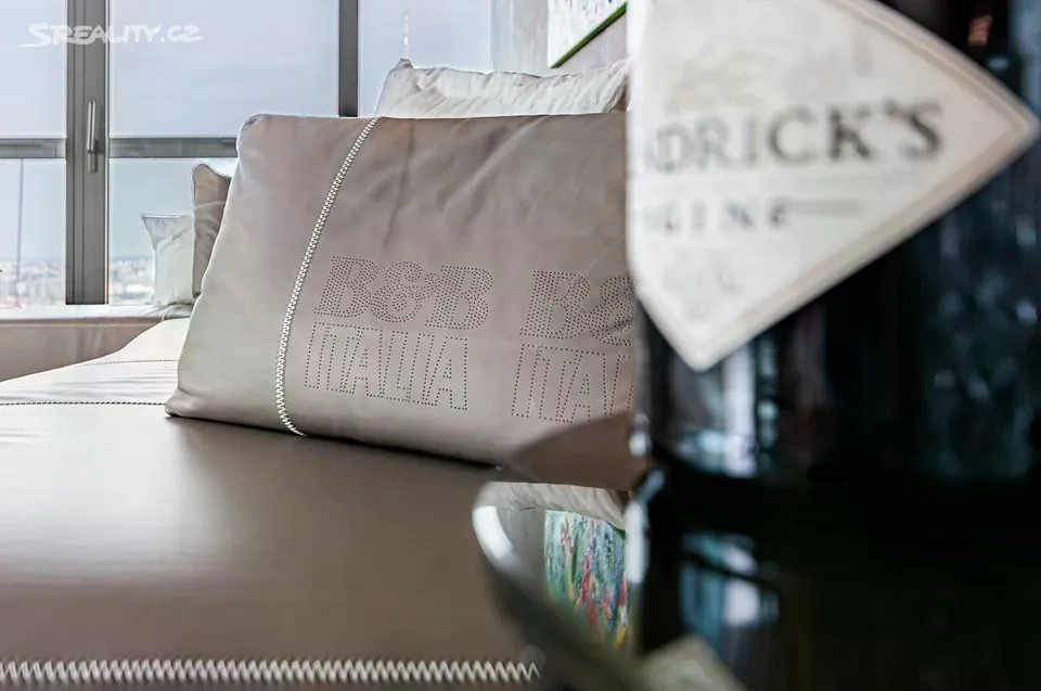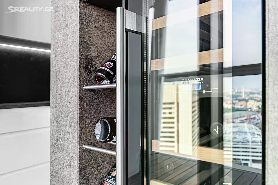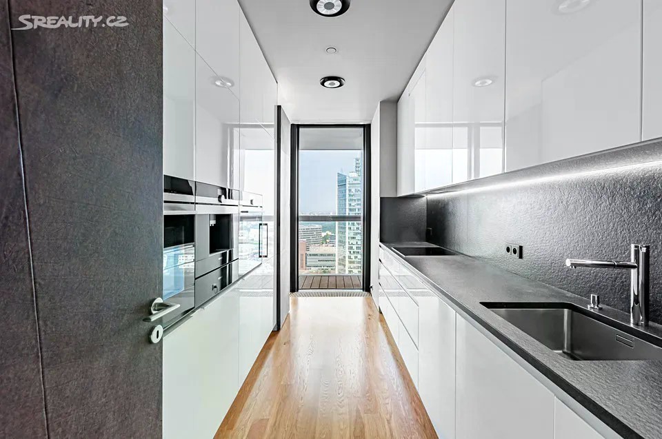 Prodej reprezentativního, luxusního, jihozápadně orientovaného bytu 4+kk (197 m2) s terasou a neopakovatelnými výhledy na Pražský Hrad, lemující celý byt s dvěma parkovacími místy a dvěma sklepy ve 24. podlaží západní věže projektu V Tower, ve třiceti patrovém 104 metrů vysokém mrakodrapu na Pankrácké pláni v Praze 4, severovýchodně od křižovatky ulic Pujmanové a Milevské, na hranici Krče a Nuslí. Budova V Tower v Praze je budova se špičkovými, nadčasovými technologiemi a luxusními materiály a zároveň ukázkovým designem s nadstandardními službami pro ty nejnáročnější rezidenty. Samozřejmostí pro rezidenty je privátní fitness, sauna, pára a bazén, privátní kino a klubové patro, golfový trenažér pro relaxaci, rychlo-dobíjecí stanice pro elektromobily. Servis 24 hodinové recepce a služby na úrovni světových luxusních rezidenčních projektů, která nemá ve střední Evropě konkurenci. Concierge službami, které pomáhají zajišťovat drobnosti jako zalévání květin, úklid či venčení domácích mazlíčků, přebírání důležité poštovní zásilky, informace, která restaurace stojí za návštěvu nebo jakou hru shlédnout v Národním divadle. Dispozice bytu 4+kk zahrnuje vstupní halu, otevřený, velkorysý prostor obývacího pokoje s přímým vstupem na terasu, samostatná kuchyň v bílém designu, dále dvě oddělené ložnice s terasou, hlavní ložnice, dvě koupelny, první koupelna (vana, sprchový kout, toaleta, bidet), druhá koupelna se sprchovým koutem, další dvě samostatné toalety, dostatečné množství úložných prostor, na míru zhotovená šatna. Celý byt lemuje fantastická terasa s neopakovatelnými výhledy, přístupná ze všech pokojů a koupelny v bytě. Vybavení zahrnuje kompletně vybavenou kuchyňskou linku Hanák v bílém lesklém designu s vestavěnými spotřebiči Miele včetně vinotéky, vestavěné šatní skříně Poggenpohl. Luxusní dřevěné podlahy v obývacím pokoji s kuchyní, v ložnicích koberce, v koupelnách carrarský mramor, velkoformátová dlažba v dekoru mědi a zařizovací předměty značky Villeroy & Boch. Osvětlení v celém bytě a exteriérové žaluzie na dálkové ovládání, plus klimatizace. Kupní cena zahrnuje kompletní vybavení dle fotografií, dvě parkovací místa a dva sklepy umístěný v 1. podzemním podlaží domu s výtahem. Zajímavá investiční příležitost zajišťující dlouhodobě stabilní výnos, vzhledem k silné poptávce po nájemních bytech pro zahraniční a českou klientelu v této žádané a ojedinělé budově s concierge službami v Praze. Energetická náročnost budovy: B