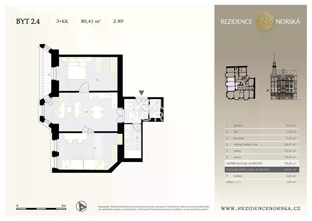 Představujeme atraktivní byt 3+kk o rozloze 75,25 m2, jehož dominantou je prostorný obývací pokoj s kuchyňským koutem a arkýřem, ze kterého se vychází na balkón s krásnými výhledy na Heroldovy sady směrem k jihu. Z obývacího pokoje jsou přístupné dvě samostatné ložnice, dispozici doplňuje velká koupelna vybavená vanou i sprchovým koutem a samostatná toaleta. Byt vyniká vzdušností, vysokými stropy a rozměrnými místnostmi s orientací na západ do ulice Norská a na jih do parku. Secesní rohový dům prošel kompletní a citlivou rekonstrukcí, která zachovala původní architektonické prvky ve společných prostorách. Nový výtah zajišťuje pohodlný přístup do všech pater. Projekt je dokončen a byt je ihned k nastěhování. Dubové parketové podlahy, dřevěná špaletová okna, koupelna osazena kvalitní sanitou, plynová kotelna v 1. podzemním podlaží Rezidence Norská se nachází v nárožním domě na křižovatce ulic Kodaňská a Norská, přímo naproti parku Heroldovy sady. Lokalita spojuje kouzlo starých Vršovic s moderním městským životem - v okolí se nachází kavárny, restaurace, kulturní podniky i veškerá občanská vybavenost širšího centra Prahy. Díky výborné dopravní dostupnosti je možné během několika minut pohodlně dosáhnout centra města.