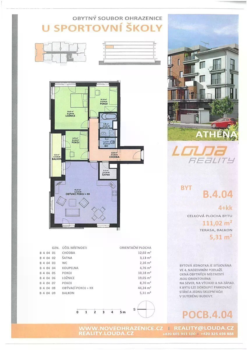 Seznamte se prosím s další částí našeho developerského projektu Nové Ohrazenice, Pardubice. Zde vzniknou dva bytové domy Athena a Artemis. Tyto dva bytové domy celkem čítají 84 bytových jednotek. Z nich nyní vybírám bytovou jednotku s dispozicí 4+kk s balkonem, o rozloze celkem 116 m2. Výstavba domů započala 01.07.2024. Byt 4+kk se bude nacházet ve 4. nadzemním podlaží. Prostorná obytná místnost s kuchyňským koutem bude mít výhled z oken na severní a západní stranu. Z obývacího pokoje je přímý vstup na balkon o rozloze 5,3 m2. Okna ostatních obytných místností bytu míří na sever a východ. V bytě se můžete dále těšit dva pokoje, jeden se vstupem na balkon, ložnici, šatnu, samostatné WC a koupelnu s vanou. Pokud potřebujete více úložného prostoru, lze si zakoupit sklepní kójí umístěnou v suterénu bytového domu. Byt bude vybaven kvalitními standardy výrobců, např. značek RAKO, Ideal Standard, Egger a Doornite. Nové Ohrazenice jsou klidnou částí Pardubic s kompletní občanskou vybaveností. Do centra města se můžete pohodlně dopravit prostředkem MHD, jejíž zastávka je 5 min od domu. Automobilem jste v centru během několika málo minut. Sjezd na dálnici D11 je vzdálen 5 min od domu. Možnost dokoupení parkovacího stání v suterénu bytového domu. Uvedená cena nezahrnuje cenu za sklepní kóji a parkovací stání. Dokončení druhé etapy výstavby je naplánováno na únor 2026. Nastěhovat se budete moci v červnu 2026.