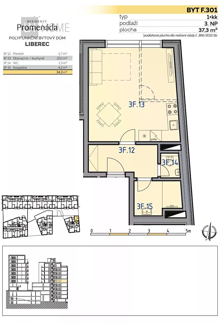 Nabízíme prodej bytu 1+kk o výměře 37,3 m2 v projektu Residence Promenáda. Byt se bude nacházet ve 3. nadzemním podlaží. Byt bude orientovaný na severní a východní stranu. Celkem bude v budově F 7. nadzemních podlaží a 3. podzemní podlaží, kde budou garážová stání. V přízemí a 1.nadzemním patře budou komerční prostory. Součástí kupní ceny jsou vinylové podlahy, keramické obklady a dlažby v koupelně a na wc. Vana, skříňka s umyvadlem a zrcadlem, topný žebřík, oddělená toaleta s umyvadélkem, Interiérové dveře s obložkami - bílé. Součástí každého bytu bude videotelefon. Možné upravit na 2+kk. Nízké provozní náklady garantuje energetický štítek A. Výstavba zahájena, předpokládaný termín dokončení 4Q 2028. Byt je možné zakoupit do osobního nebo družstevního vlastnictví. Celkem bude v tomto novém projektu 247 nových bytů o dispozicích 1+kk, 2+kk a 3+kk, dostatek garážových stání i sklepů. Aktuálně prodáno přes 100 bytů. Přehled volných bytů naleznete na našich webových stránkách. V případě bližších informací jsme k dispozici. Parcelní číslo 4064/3