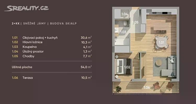 Zvažujete koupi bytu v malebném horském prostředí? Máme pro vás zajímavou nabídku. Jedná se o atraktivní apartmány situované přímo v srdci Krkonoš v obci Rokytnice nad Jizerou. 3 moderní budovy o 39 apartmánech v rezidenci Rokytná resort disponující úchvatnými výhledy na panoramata hor budou dokončeny v roce 2027. Nabízí komfortní bydlení s vysokým důrazem na kvalitu, detail a moderní technologie. Rokytnice nad Jizerou se stává atraktivním ski resortem budoucnosti díky plánovaným investicím, které zahrnují modernizaci zasněžovacího systému a vybudování nových lanovek. Aktualizované informace o dostupnosti jednotlivých apartmánů naleznete na webových stránkách zmiňovaného resortu. Jako vzorový apartmán 2+kk uvádíme například apartmán s názvem "Sněžné jámy", který se nachází v budově Skialp a disponuje užitnou plochou 54 m². K bytu náleží také terasa o velikosti 10,5 m², která poskytuje ideální místo pro relaxaci s výhledem na okolní přírodu. Výhodou je jižní orientace bytu, díky které je interiér bytu světlý a slunný po většinu dne. Byt nabízí prostorný obývací pokoj, ložnici, koupelnu a komoru. Součástí je podlahové vytápění, kompletní koupelnové vybavení a kuchyňská linka vč. spotřebičů, přičemž lze upravit povrchové materiály dle přání kupujícího. Díky výtahu je apartmán snadno přístupný i pro osoby se sníženou pohyblivostí. Ke každému apartmánu náleží rezervované prostory na uložení lyží či kol, přístup do společného wellness s finskou saunou a na rozlehlou zahradu resortu s odpočinovými zónami. Možnost dokoupení garážového stání nebo venkovního parkovacího místa, což je v horské oblasti velkým benefitem. Stavba je domyšlena do největších detailů po stránce komfortu pro majitele, ať už díky sportovnímu zázemí, tak díky moderním technologiím včetně vysokorychlostního optického internetu. Tento apartmán je ideální volbou nejen pro milovníky hor a přírody, ale také pro ty, kteří hledají skvělou investiční příležitost v rychle se rozvíjejícím horském středisku. Lokalita nabízí výborné zázemí pro celoroční sportovní aktivity - v blízkosti jsou lyžařské areály, turistické trasy i cyklostezky. Přímo u domu je zastávka Skibusu a v Rokytnici nad Jizerou najdete kompletní občanskou vybavenost. Skvělá příležitost pro rekreační bydlení i investici.