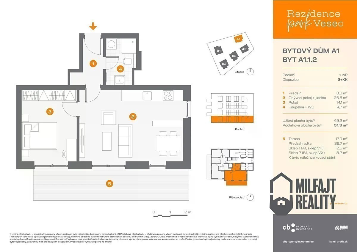Nabízíme vám krásný nový byt 2+kk o velikosti 51,3 m² ve Vesci v Liberci. Rezidence Park Vesec je skvělou volbou pro každého, kdo hledá spojení moderního komfortního bydlení a prakticky neomezených možností sportovního vyžití. Otevřená krajina plná zeleně s celou řadou sportovních areálů představuje perfektní domov pro aktivní jedince všech věkových kategorií. Bezpečí, klid a bezprostřední blízkost mateřské i základní školy pak představují ty nejlepší podmínky pro spokojený život rodin s dětmi. Cesta do centra Liberce odtud netrvá ani 15 minut Rezidence Park Vesec tvoří pět čtyřpodlažních bytových domů. Celkem 58 bytů o dispozicích 2+kk, 3+kk a 4+kk je navrženo pro pohodlné bydlení s důrazem na přírodní materiály a udržitelný přístup k výstavbě. Najdete zde park a místo pro setkávání se sousedy, přáteli, ale i dětské hřiště. To vše v uzavřeném areálu pouze pro majitele bytových jednotek. Velkou výhodou je dokončení celého komplexu v jeden okamžik, nebudete tedy bydlet na stavbě, ale již v hotových domech. Dalším plusem je pak zařazení domů do energetické třídy B - velmi úsporné. Byt, který vám chci představit, se nachází v 1. nadzemním podlaží a jeho dispozice zahrnují obývací pokoj s kuchyňským koutem o rozloze 26,5 m², pokoj o velikosti 14,1 m² a koupelnu s toaletou o velikosti 4,7 m². Součástí bytu jsou 2 sklepní kóje o velikosti 2,5 m² a 8,2 m². K bytu náleží terasa (17 m²) s předzahrádkou o velikosti 39,7 m². Každý byt je vybaven podlahovým vytápěním, okny s trojskly a venkovními roletami. Byty jsou prodávány do osobního vlastnictví. Pro rezervaci stačí složit 10% kupní ceny bytu. Zbývající část je možné uhradit po kolaudaci v listopadu 2026. K nastěhování budou byty v únoru 2027. O tom, jakou atmosféru má místo a projekt Rezidence Park Vesec, se přijďte přesvědčit osobně do nového showroomu přímo v místě výstavby. Stačí zavolat a domluvit si termín. Rádi Vám s výběrem bytu poradíme nejen při osobní schůzce. Nehledejte dlouze parametry bytů sami, obraťte se na nás. Těšíme se na viděnou.
