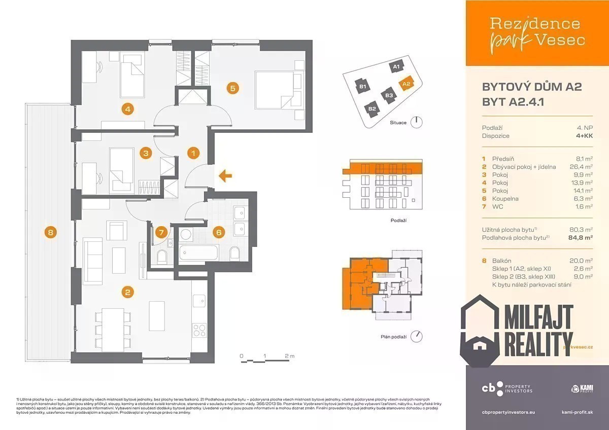 Nabízíme vám krásný nový byt 4+kk o velikosti 84,8 m² ve Vesci v Liberci. Rezidence Park Vesec je skvělou volbou pro každého, kdo hledá spojení moderního komfortního bydlení a prakticky neomezených možností sportovního vyžití. Otevřená krajina plná zeleně s celou řadou sportovních areálů představuje perfektní domov pro aktivní jedince všech věkových kategorií. Bezpečí, klid a bezprostřední blízkost mateřské i základní školy pak představují ty nejlepší podmínky pro spokojený život rodin s dětmi. Cesta do centra Liberce odtud netrvá ani 15 minut Rezidence Park Vesec tvoří pět čtyřpodlažních bytových domů. Celkem 58 bytů o dispozicích 2+kk, 3+kk a 4+kk je navrženo pro pohodlné bydlení s důrazem na přírodní materiály a udržitelný přístup k výstavbě. Najdete zde park a místo pro setkávání se sousedy, přáteli, ale i dětské hřiště. To vše v uzavřeném areálu pouze pro majitele bytových jednotek. Velkou výhodou je dokončení celého komplexu v jeden okamžik, nebudete tedy bydlet na stavbě, ale již v hotových domech. Dalším plusem je pak zařazení domů do energetické třídy B - velmi úsporné. Byt, který vám chci představit, se nachází v 4. nadzemním podlaží a jeho dispozice zahrnují slunný a prostorný obývací pokoj s kuchyňským koutem o rozloze 29 m², 2 pokoje o velikosti 10,2 m² a 13,9 m², ložnici (14,1 m² ) a koupelnu o velikosti 3,8 m² se samostatnou toaletou. Nechybí ani prostorná předsíň o velikosti 7,9 m². Součástí bytu je sklepní kóje o velikosti 2,6 m². K bytu náleží balkón (20 m²). Jako každý byt je vybaven podlahovým vytápěním, okny s trojskly a venkovními roletami. Navíc má tento byt ve standardu dřevěné podlahy, HS portál u vstupu na balkón a je zde možné vybudování klimatizační jednotky. Byty jsou prodávány do osobního vlastnictví. Pro rezervaci stačí složit 10% kupní ceny bytu. Zbývající část je možné uhradit po kolaudaci v listopadu 2026. K nastěhování budou byty v únoru 2027. O tom, jakou atmosféru má místo a projekt Rezidence Park Vesec, se přijďte přesvědčit osobně do nového showroomu přímo v místě výstavby. Stačí zavolat a domluvit si termín. Rádi Vám s výběrem bytu poradíme nejen při osobní schůzce. Nehledejte dlouze parametry bytů sami, obraťte se na nás. Těšíme se na viděnou.