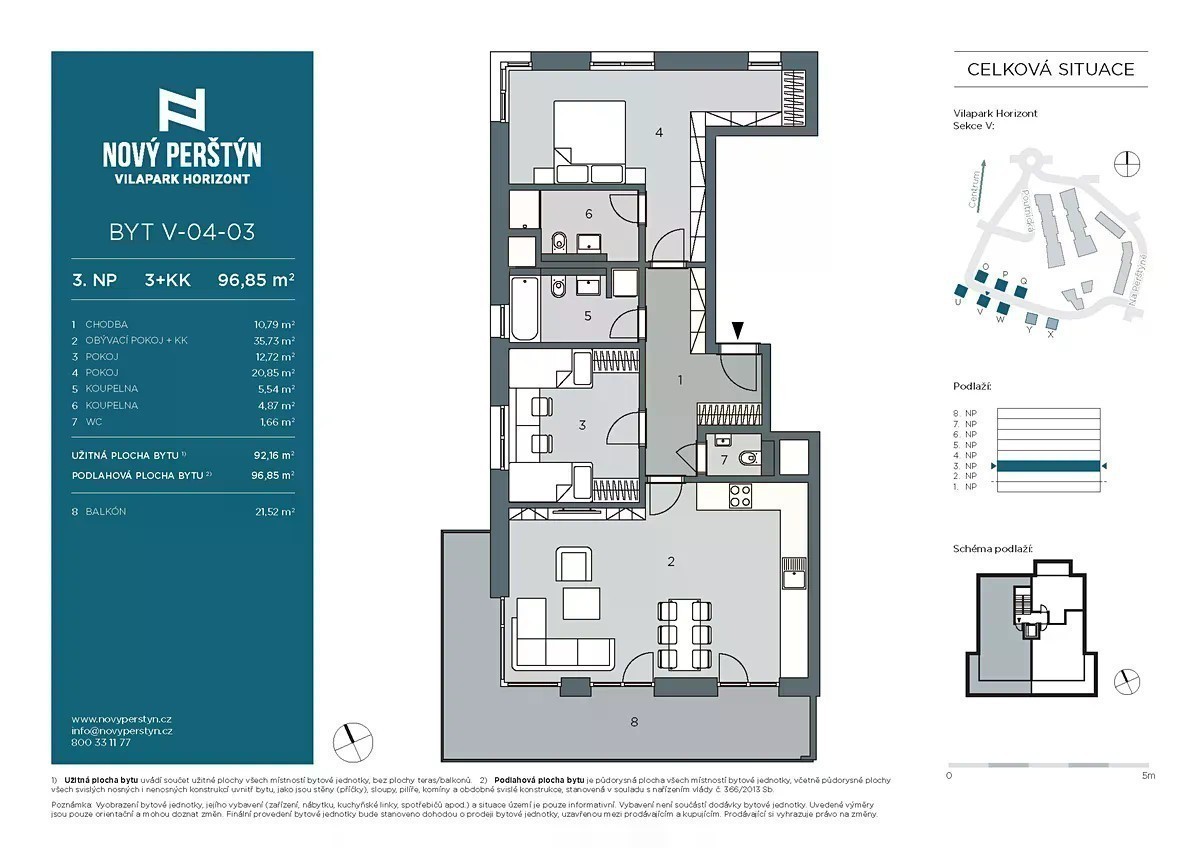 Nový byt č. W-01-02 o dispozici 3+kk (96,89 m2) s terasou (21,9 m2) a předzahrádkou (369,97 m2) se nachází v 2. nadzemním podlaží budovy „W“ v projektu Nový Perštýn, Vilapark Horizont. Soubor bytových domů Vilapark Horizont nabízí bydlení ve standardu 21. století. Fasády vytříbené architektury využívají ty nejmodernější stavební materiály a provedení, i s ohledem na umístění do horského prostředí Liberce. Byty zaujmou především velkými francouzskými okny a luxusními balkóny s výhledy na celý Liberec a Jizerské hory i do okolní zeleně. Budoucí obyvatelé rovněž ocení propracované dispozice bytu pro spokojený a komfortní život. V interiéru je počítáno také s prostorem pro zabudované skříně, které napomohou efektivnímu a praktickému využití celé plochy bytu. Velká pozornost byla věnována výběru podlah, obkladů, dlažeb, zařizovacích předmětů a armatur v koupelnách. Nabízíme bydlení v budovách s nízkou spotřebou energií a s nimi spojenými náklady na provoz bytu, ať již bude byt užíván trvale, nebo jen sezonně jako rekreační či investiční nemovitost. K bytu je potřeba dokoupit 1 parkovací stání a sklepní kóji. Projekt nové městské čtvrti Nový Perštýn výrazně změní tvář historicky významné části Liberce. Postupně zde v několika etapách výstavby vyroste víceúčelový komplex domů spolu s veřejným prostorem a parkem. Projekt zahrnuje komfortní bydlení, nové obchody, služby a moderní kanceláře. Atmosféra Nového Perštýna - včetně jeho druhé části, Vilaparku Horizont - zůstává stranou od dopravního ruchu, záměrně uzavřená do svého klidu vhodným umístěním budov do členitého terénu a cíleně koncipované rozsáhlé zeleně. Místo téměř v srdci města s bezproblémovou dopravní dostupností, v bezprostřední blízkosti hor, ve zdravém prostředí čistého vzduchu, s bohatým sportovním i kulturním vyžitím, funkční sociální infrastrukturou a zejména bydlením splňujícím ty nejvyšší nároky - to vše dělá z této adresy perspektivní a lukrativní místo, které se může stát stejně tak životní investicí, jako nejlepším bydlením v širokém okolí. Výstavba budov Vilaparku Horizont byla zahájena na jaře 2024. Dokončení je plánováno na 2. polovinu roku 2026. Více informací o projektu a lokalitě naleznete na webu projektu Nový Perštýn nebo přímo u našich prodejců.