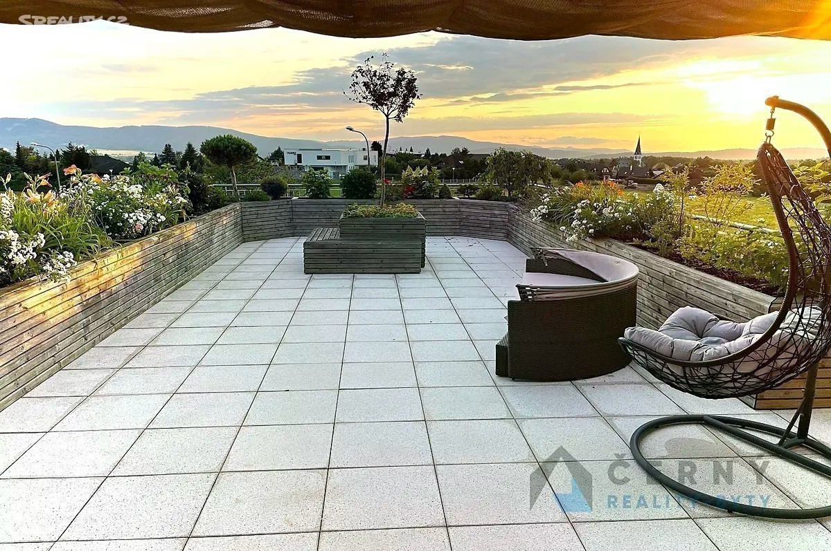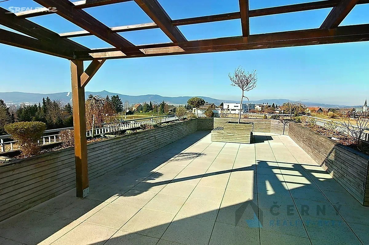 Rodinný dům se zahradou? Hezká představa, ale kde vzít čas a energii udržet dům i zahradu stále v perfektním stavu? Dobře, a co luxusní byt v novostavbě? Jistě - bez starostí, ale tam zase chybí ta možnost bezprostředního pobytu na čerstvém vzduchu, letní grilovačky s přáteli nebo úžasného relaxu při péči o rostlinky. A já si troufám říci, že tohle dilema vám pomůže vyřešit moje následující nabídka. Luxusní byt o velikosti 3+kk, s balkonem, garážovým i venkovním stáním, a především s nádhernou, prostornou terasou o výměře 87m2. Byt je umístěn ve 2. nadzemním podlaží moderního, nízkoenergetického viladomu, stojícího v místě, které je v Liberci právem považováno za TOP lokalitu. Poklidná čtvrť na severním okraji města, na samotném úpatí Jizerskohorského pohoří, s výhradně obytnou zástavbou převládajících rodinných domů se zahradami.Klid, čisté prostředí a především blízkost nádherné přírody Jizerských hor je to, co činí lokalitu tolik přitažlivou pro bydlení. Moderní, krásně prosvětlený a celodenně osluněný byt má plochu 74m2. Centrem bytu je prostorný obývací pokoj s kuchyňským koutem. Celá jižní stěna pokoje je prosklená a nabízí krásný výhled do širokého okolí. Před přímým sluncem poskytuje ochranu protisluneční okenní folie. Kuchyňský kout je osazen moderní prostornou linkou, vybavenou kvalitními spotřebiči. Z pokoje je výstup na balkon s prosklenými bočnicemi. Koupelna bytu je vybavena sprchovým koutem a umyvadlovým setem se skříňkou. Toaleta je samostatná, rovněž s vlastním umyvadlem. Dalšími místnostmi bytu jsou dětský pokoj a ložnice, kde je zabudovaná prostorná šatní skříň. Druhá vestavná skříň je umístěna v předsíni bytu. Každý z menších pokojů má výstup na krásnou venkovní terasu. Terasa je po celém obvodu lemovaná zelení, při vstupu stojí dřevěná pergola s možností zastínění protisluneční plachtou. V této části je dostatek místa pro gril i stolování. Kouzelným prvkem je strom, zasazený uprostřed terasy ve velkém truhlíku s posezením. Naprosto úžasné jsou panoramatické výhledy jak na Ještědské pohoří s jeho dominantou vysílače Ještěd, tak i na panoramata Jizerských hor. Celý byt má podlahové vytápění. Zdrojem topení je vlastní plynová kotelna v domě. Z hlediska energetické náročnosti je objekt zařazen v úsporné třídě B. Součástí bytu jsou dvě parkovací stání - jedno kryté, v podzemích garážích domu, druhé venkovní před domem. K bytu náleží sklep. Byt je bezbariérový - v domě výtah. Velmi atraktivní bydlení, co říkáte? Pokud máte zájem, rád vás bytem provedu nebo zodpovím vaše případné dotazy.