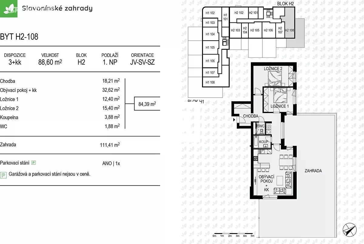 Z pověření developera Vám realitní kancelář ALLE reality&development s.r.o. v exkluzivním zastoupení nabízí již V. etapu úspěšného Projektu Slavonínské zahrady, jež navazuje prodejem - budovy B. Projekt umožňuje svým rezidentům dostupné bydlení v příjemné a klidné lokalitě města Olomouce. Více informací na webových stránkách alle. Byt B1.1.1 o dispozici 3+kk má podlahovou plochu 80,1 m², terasa o velikosti 14,4 m² a zahrada o velikosti 60,1 m2 se nachází v 1.NP bytového domu s nízkým počtem bytových jednotek. Velkou předností lokality je dostatek zeleně, odpočinková zóna kolem přírodního rybníku Hamrys, cyklistická stezka, to vše pro čas odpočinku. Skvělá občanská vybavenost, vynikající dostupnost MHD včetně nově prodloužené tramvajové tratě, a bezproblémový výjezd na dálnici naopak usnadní pracovní část dne. Vysoký komfort bydlení je zajištěn moderním standardním vybavením: podlahové vytápění po celé ploše jednotek, obložkové zárubně, vinylové podlahy, keramické obklady - vše dle volby klienta a také základní příprava pro venkovní žaluzie. Garážová stání a komory k dokoupení jsou samozřejmostí. Vyberte si své vysněné bydlení včas! Klient hradí nad rámec kupní ceny poplatek za právní a administrativní servis.