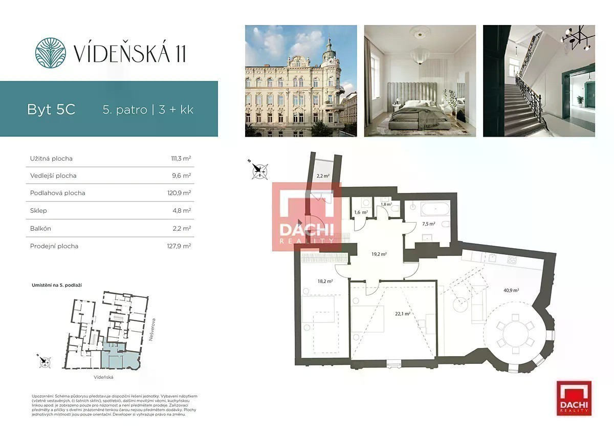Historie, styl a naprostý klid - to vše nabízí byty v exkluzivním projektu Vídeňská. Nabízíme Vám jako výhradní prodejce naprosto výjimečný penthouse 3+kk v nejvyšším podlaží rezidence Vídeňská 11. Tento podkrovní byt o podlahové ploše 120,9 m² se nachází v 5. podlaží historické budovy z roku 1899. Jeho naprostou raritou je architektonicky výrazná věžička, která tvoří výjimečný a inspirativní prvek interiéru. Nabízí se zde možnost vybudovat druhé patro, které může sloužit jako relaxační kout, domácí knihovna nebo klidová zóna - jde o prostor s velkým potenciálem a charakterem, jaký se opravdu jen tak nevidí. Byt je orientován na jihozápad, díky čemuž je během dne krásně světlý. Podkrovní okna zajišťují dostatek denního světla, které podtrhuje vzdušnost a jedinečnost celého prostoru. Dispozice je promyšlená a atmosféra bytu vyniká osobitostí, kterou nenajdete v žádné novostavbě. K bytu náleží také balkon o výměře 2,2 m², orientovaný do klidného vnitrobloku - ideální pro soukromé posezení. Samozřejmostí je také plně integrovaná klimatizace a elektrické žaluzie u stropních oken, které zajišťují maximální komfort a kontrolu nad světlem i teplotou interiéru. Součástí bytu je exkluzivní vybavení včetně koupelen Gessi, osvětlení Modular, podlah Foglie D'Oro od českých mistrů Valen&Masar a prémiové keramiky značky Porcelanosa. Součástí každého bytu ve Vídeňské 11 je praktický sklep. K tomuto konkrétnímu bytu náleží sklep o velikosti 4,8 m², který doplňuje byt o potřebný úložný prostor. U nabídky naleznete video, které zachycuje atmosféru rezidence a záběry z více bytových jednotek. Slouží k představení celkového charakteru nemovitosti. Pro vaši lepší představu také mohou některé fotografie zobrazovat vybavený interiér vytvořený pomocí AI - jedná se o inspirativní vizualizace, nikoliv aktuální stav bytu. Byt je ihned k nastěhování a kdykoliv k dispozici k osobní prohlídce. Ozvěte se nám. Vídeňská 11 není jen bydlení - je to prostor pro výjimečný způsob života.