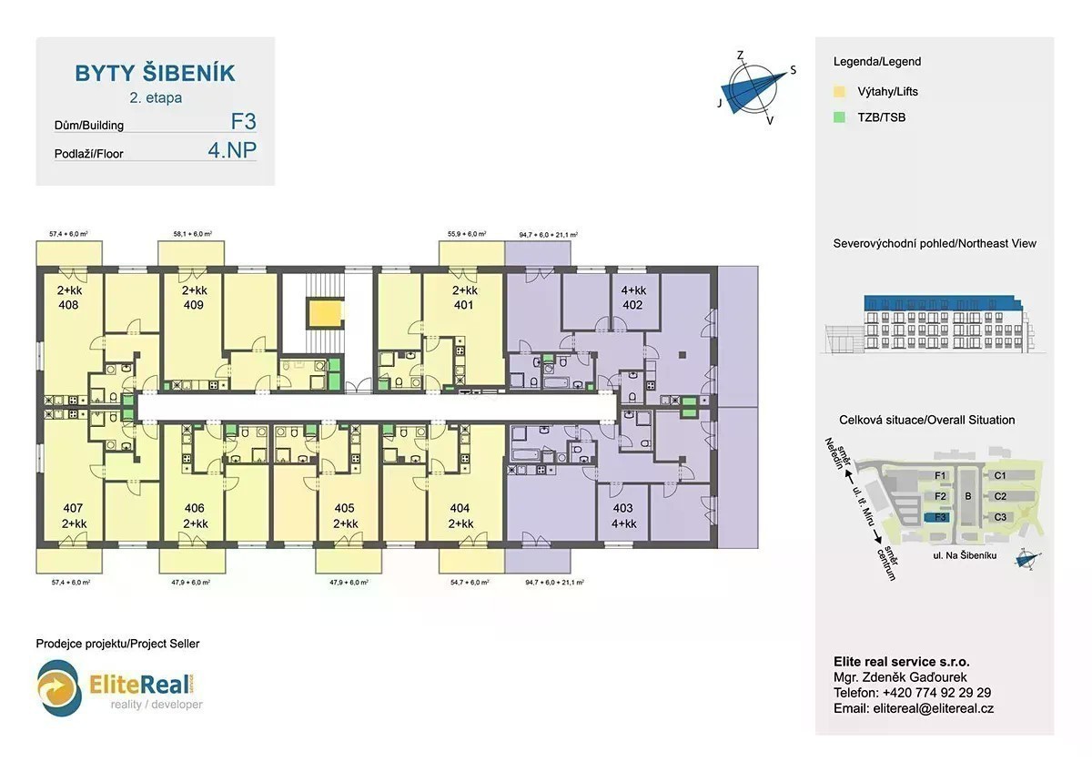 Prodáno 90% bytů. Elite real service s.r.o., prodejce projektu, Vám nabízí prodej nové bytové jednotky přímo v centru města Olomouce v developerském projektu Nový Šibeník 2.etapa (předpokládaný termín dokončení 12/2025). Bytová výstavba je situována v exkluzivní lokalitě přímo v centru města v blízkosti ulice Na Šibeníku v městské části Nová Ulice, Olomouc. Bytová jednotka F2.402 4+kk je orientována na jihozápad. Plocha jednotky 94,70 m2 + plocha terasy 21,1 m2 + plocha terasy + 6 m2. Zajistíme Vám bezplatně financování nemovitosti. Nabízíme klientům služby vlastního hypotečního centra s výhodami, které jsme pro Vás s bankovními ústavy připravily. Kupte si nové nízkonákladové bydlení - bytový dům je zařazen do energetické třídy B. Půdorys bytové jednotky, který zde prezentujeme, je základní. Dispozici nové jednotky a design si můžete upravit dle vlastních požadavků. Jednotky je možné slučovat i rozdělovat dle fáze výstavby. Nechte si postavit nový byt dle vašich představ. K novému bytu je možno dokoupit sklep nebo vnitřní parkovací stání. Standardní vybavení bytů splňuje požadavky moderního bydlení (keramická podlaha, obložkové zárubně, moderní keramické obklady, francouzské okna, atd.). Klientům nabízíme možnost kompletního návrhu a řešení interiéru. Výjimečná investiční příležitost koupě nového bytu přímo v centru města u tramvajové zastávky s docházkovou vzdáleností 7 minut pěšky do historického centra. Pro investory zajišťujeme bezplatně následný pronájem, případně i správu nemovitosti. Doporučujeme osobní jednání a prohlídku výstavby - volejte makléře. Bližší informace k bytovému projektu a největší nabídku novostaveb - nových bytů, bytů na prodej, bytů k pronájmu - naleznete na našich webových stránkách.