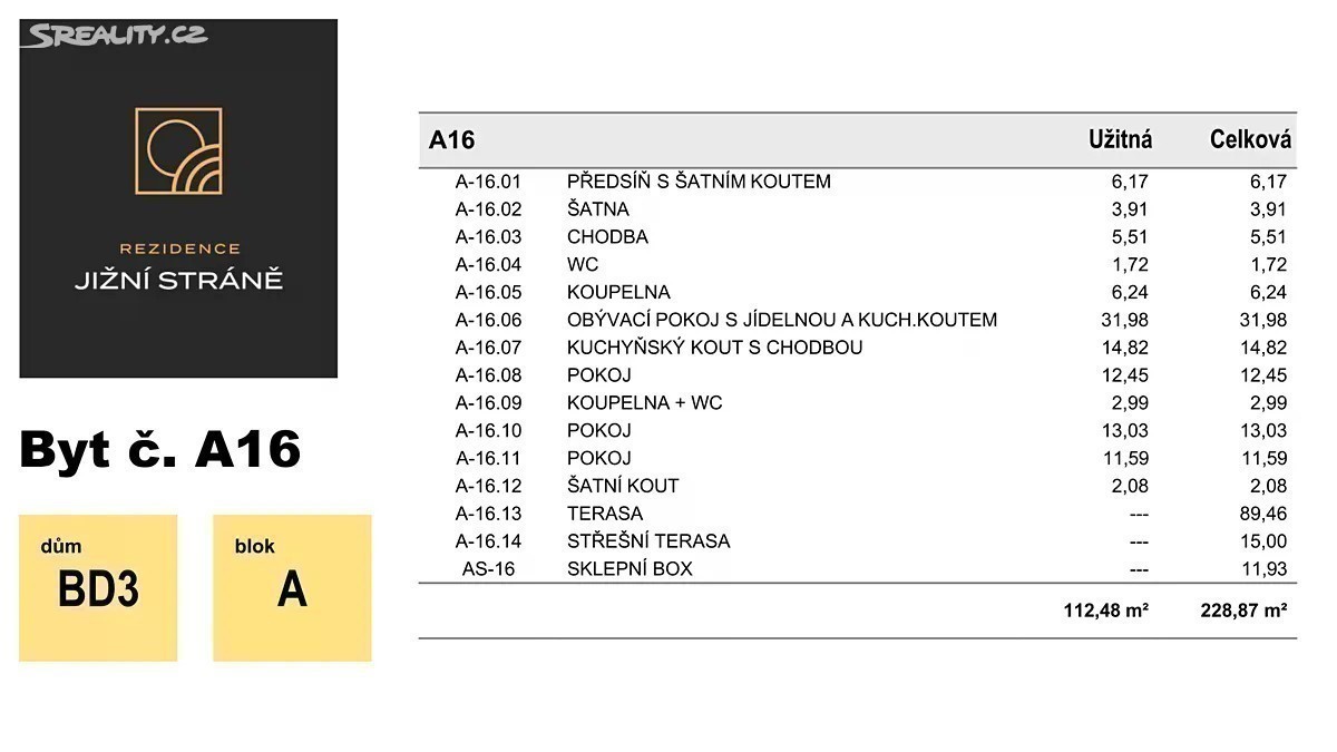 Představujeme vám nově vznikající jedinečný projekt bytových domů „Rezidence Jižní Stráně“ v lukrativní a žádané lokalitě na ulici Leopolda Pospíšila v Olomouci. V této druhé etapě vznikne bytový dům BD 3 o dvou blocích A,B propojených suterénním parkovištěm s celkem 36 byty. V rámci této etapy vám nabízíme k prodeji byt 4+kk (označení BD3A16) s celkovou plochou 213,45 m² (byt 112,06 m², terasa 89,46 m² a sklep 11,93 m²). Cena bytové jednotky zahrnuje vysoký volitelný standard (kvalitní vinylové podlahy, zařizovací prvky koupelen Villeroy & Boch, Grohe, velkoformátové obklady a dlažba, plné laminátové CPL dveře a další). Komfort bydlení výrazně zvyšují prvky jako teplovodní podlahové vytápění, rekuperace a venkovní elektrické žaluzie, které jsou součástí standardu. Jednotka sestává ze dvou neprůchozích pokojů, obývacího pokoje s kuchyňským koutem, koupelny, samostatného WC, předsíně, šatního koutu, terasy a sklepního boxu. K bytu je možné dokoupit parkovací stání v suterénu domu. V průběhu přípravy projektu jsme kladli důraz na optimální dispoziční řešení, které splňuje požadavky náročného klienta. Výjimečnost projektu umocňuje jeho umístění ve svažitém terénu. Nabízíme vám možnost vlastnit nemovitost v jedné z nejlepších lokalit Olomouce s plnou občanskou vybaveností a výbornou dopravní dostupností do všech částí města. V případě zájmu kontaktujte manažera projektu.