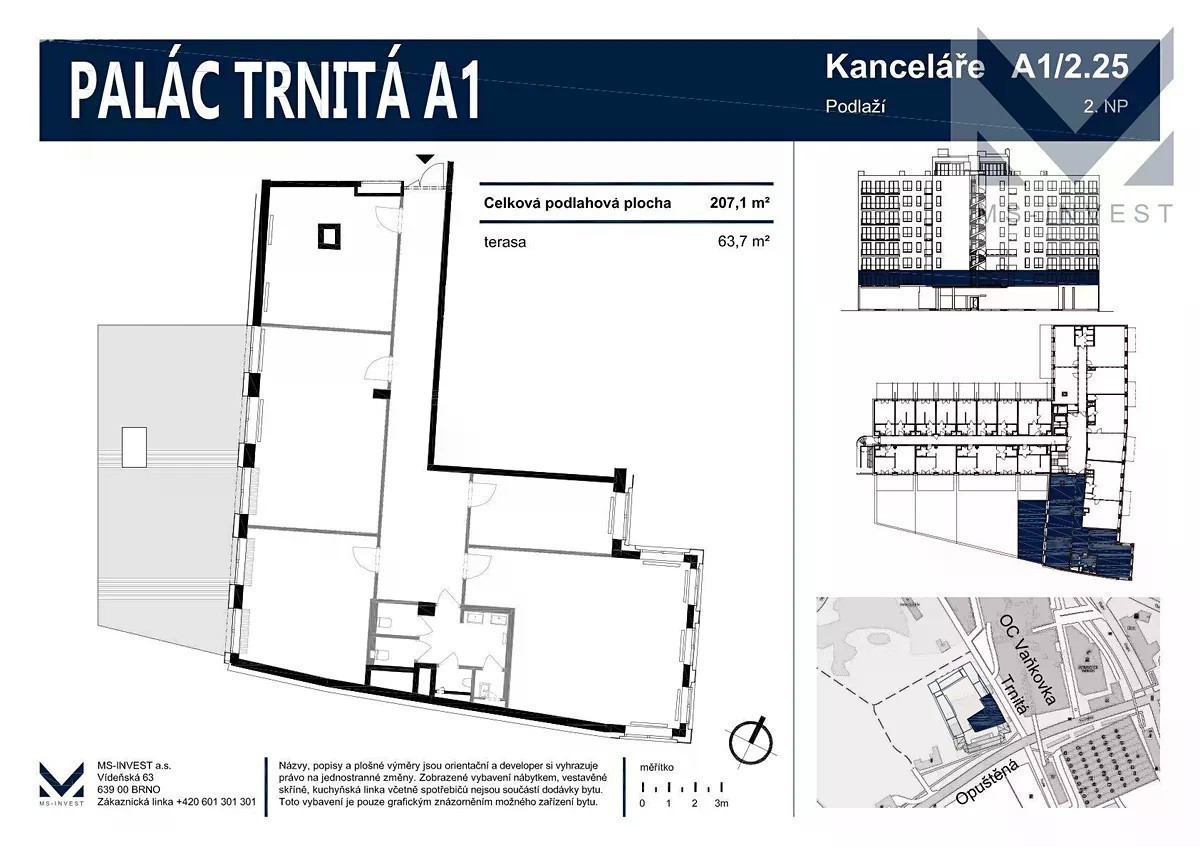 V novém developerském projektu Palác Trnitá, který najdete v hlavní rozvojové zóně města Brna, v těsném sousedství historického centra města Brna a NC Vaňkovky, nabízíme prodej kancelářského prostoru o výměře 207 m2, který se nachází ve 2. NP se vstupem z ulice Trnitá. K prostoru náleží velkorysá terasa o výměře 64 m2 orientovaná do klidného vnitrobloku. Kancelářský prostor nabízíme ve standardu shell and core, možnost dokoupení GS. K dispozici ihned.