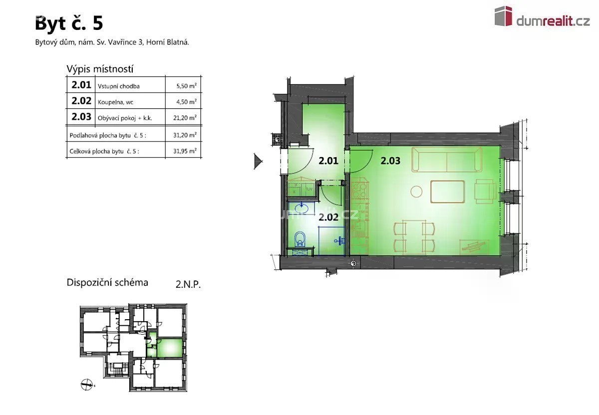 Naše společnost Vám zprostředkuje prodej apartmánů na náměstí Sv. Vavřince v Horní Blatné, které se nachází v blízkosti několika lyžařských areálů jako je Plešivec, Potůčky nebo Klínovec. Apartmán číslo 5. se nachází v prvním patře, je o velikosti 31 m² s výhledem na náměstí a kostel Sv.Vavřince. Dispozice bytu 1+KK. Všechny apartmány jsou vybaveny sanitární keramikou v koupelnách, sprchovým koutem Walk-in, podlahovou krytinou a to v kombinaci velkoformátové dlažby a plovoucí podlahy v dekoru dřeva, obložkami, interiérovými a vstupními dveřmi a kompletní přípravou na osazení kuchyňské linky. Ke každému apartmánu patří jedno soukromé parkovací místo hned u domu a jedna sklepní kóje, vše je již započítáno v uvedené ceně. Součástí jsou také nádherné společné prostory a to včetně sklepního prostoru s možností posezení. Vytápění apartmánů je elektrické s dálkovým ovládáním s připojením na Wi-Fi. V apartmánovém domě se nachází 12 jednotek od 1+KK až po 3+KK různých podlahových výměr. Několik apartmánů je již prodáno. Izolant obvodových stěn 16-18cm polystyrenové dílce a 28cm minerální vlna v podkrovní části domu. Nemovitost se nachází přímo na náměstí s výhledem na hory a kostel Sv. Vavřince. Koupě apartmánu je ideální také jako investice, kdy jsou Krušné hory celoročně navštěvovány turisty a Horní Blatná patří svým umístěním mezi nejvíce vyhledávané. V blízkosti apartmánu se nachází Blatenský vrch, Vlčí jámy a mnoho turistických a cyklo tras. Nemovitost s možností odpočtu DPH z uvedené kupní ceny. Fotky se zařízením a kuchyňskou linkou jsou z referenčního bytu číslo 10. Doporučuji nezávaznou prohlídku objektu s možností vybrat si právě ten VÁŠ apartmán. Uvedené fotografie s jíž osazenou kuchyňskou linkou a vybavením jsou z referenčního bytu č. 10. Ev. číslo: 651370.
