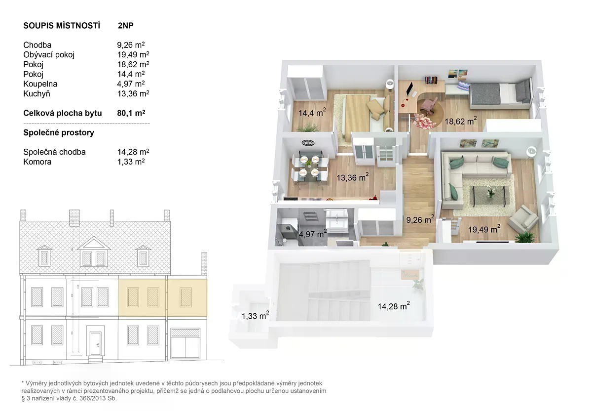 Nabízíme k prodeji bytovou jednotku o dispozici 3+1 s výměrou 80 m2 v bytovém domě, který prošel kompletní rekonstrukcí. Bytová jednotka je prostorná a světlá. Bude vybavena kuchyňskou linkou s vestavnými spotřebiči (varná deska+trouba, odsavač par, myčka). Prostorná koupelna je vybavena sprchovým koutem, umyvadlovou skříňkou se zrcadlem, toaletou a žebříkovým otopným tělesem. V celém bytě je vinylová podlaha. Dům je podsklepen a ke každému bytu náleží sklepní kóje. Dům je na klidném místě s možností využití dvorku, který je součástí domu. V domě se nachází pouze šest bytových jednotek, a tak se vyznačuje klidným bydlením. V těsné blízkosti se nachází autobusová zastávka. Dům disponuje i garáží, kterou lze samostatně odkoupit.