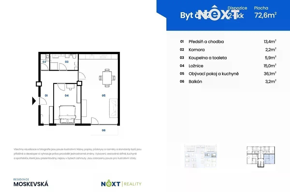 Výjimečné bydlení v samém srdci Karlových Varů - Rezidence Moskevská. Světlý a elegantní byt o dispozici 2+kk a podlahové ploše 72,6 m² se nachází ve 3. nadzemním podlaží prestižní novostavby. Tato rezidence patří k velmi žádaným projektům v centru města a spojuje moderní architekturu s praktickým komfortem. Byt vyniká svou promyšlenou dispozicí, která zajišťuje maximální využití prostoru a pocit vzdušnosti. Velká okna přinášejí do interiéru dostatek denního světla, což ještě umocňuje atmosféru otevřeného a příjemného bydlení. Moderní kuchyňská linka je součástí vybavení, takže byt je připraven k okamžitému nastěhování. Rezidence Moskevská je synonymem pro pohodlí městského života. V bezprostřední blízkosti naleznete obchody, kavárny, restaurace i lázeňskou promenádu, přičemž klidné prostředí samotného domu poskytuje příjemné zázemí pro každodenní život i odpočinek. Obyvatelům je k dispozici výtah, bezbariérový vstup a možnost vlastního parkovacího stání ve vnitrobloku. Tento byt představuje ideální volbu jak pro vlastní bydlení, tak i jako výhodnou investici s nízkými provozními náklady. Nechte se oslovit kombinací exkluzivní lokality, moderního designu a pohodlí rezidenčního bydlení. V Rezidenci Moskevská jsou aktuálně k dispozici už jen poslední dvě bytové jednotky - nenechte si ujít tuto jedinečnou příležitost. Byt je v osobním vlastnictví a v případě zájmu lze financovat úvěrem přes naše hypoteční centrum. Pouze u nás vám zajistíme moderní financování až na 35 let, bez ohledu na věk a prokazování příjmů, či nutnosti předkládat daňové přiznání (u podnikatelů). Zeptejte se nás a bydlete chytře! Pro komunikaci uvádějte evidenční číslo zakázky N111254.