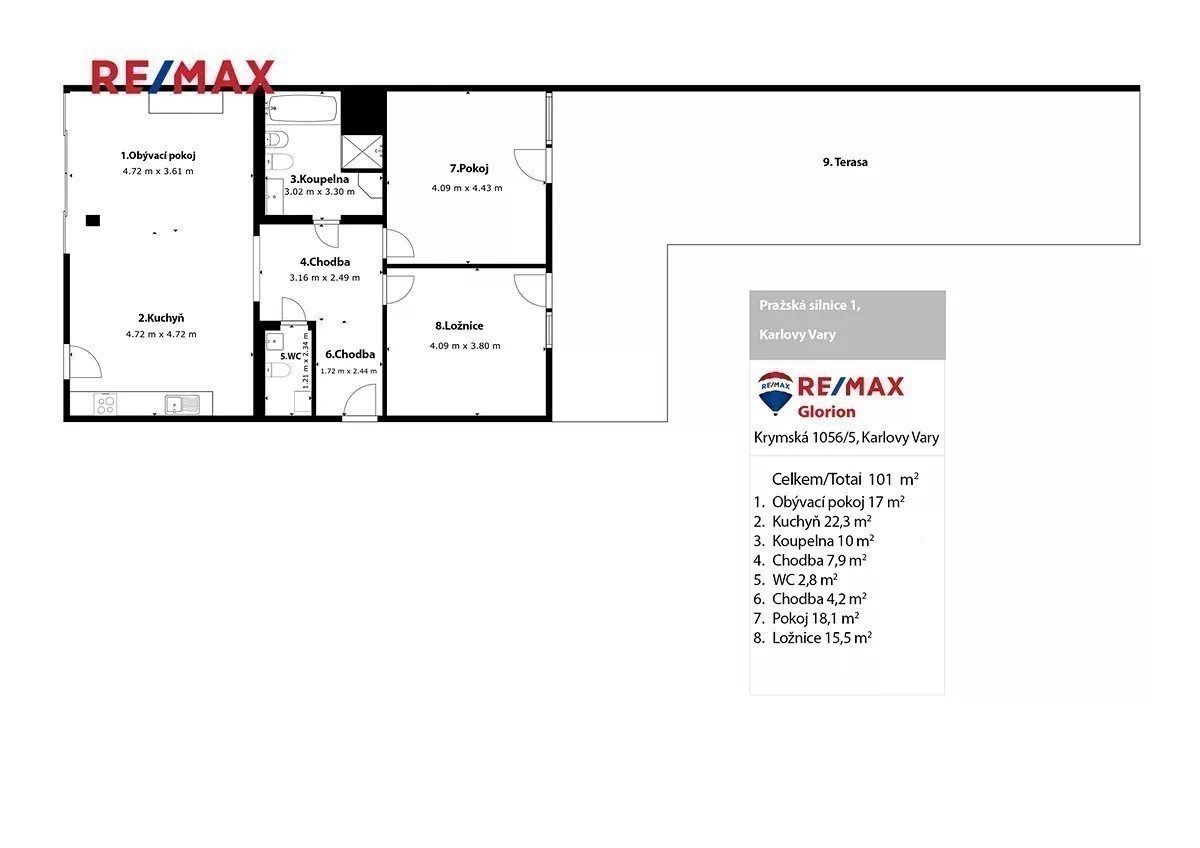 Nabízíme k prodeji prostorný a moderní byt 3+kk o rozloze 99 m2 nacházející se na Pražské ulici s jedinečným výhledem na Imperial. Tento byt je ideální volbou pro ty, kteří hledají komfortní a elegantní bydlení v klidné, ale dobře dostupné lokalitě. V těsné blízkosti se nachází zastávka MHD, škola, školka, obchod z potravinami, Lanovka Imperial, která vás pohodlně dopraví do historického centra města - Kolonádě. Byt se nachází v novostavbě z roku 2010 a nabízí moderní interiér s kvalitními materiály. Dominantou bytu je německá kuchyňská linka a nábytek. Podlahy pokrývá kvalitní parkety, kteří dodává interiéru útulnou atmosféru. Díky francouzským oknům je byt krásně prosvětlený a nabízí úžasný výhled. Pro ještě větší komfort jsou okna vybavena žaluziemi, které chrání byt před přehříváním a umožňují regulovat množství denního světla podle potřeby. Velkou výhodou bytu jsou dva samostatné koupelny, které zajišťují komfort a pohodlí pro celou rodinu. Hlavní perlou tohoto bytu je však prostorná terasa, která nabízí dostatek místa pro relaxaci, grilování nebo pěstování rostlin. Dům má vysoký standard zabezpečení - vstup do budovy, výtahu i garáží je možný pouze na čip. K bytu náleží také soukromé parkovací místo přímo v domě, což je v této lokalitě velkou výhodou. Pokud hledáte moderní bydlení s velkým venkovním prostorem, nádherným výhledem a vysokým standardem bezpečnosti, tento byt je ideální volbou. Neváhejte nás kontaktovat pro více informací nebo domluvení prohlídky!