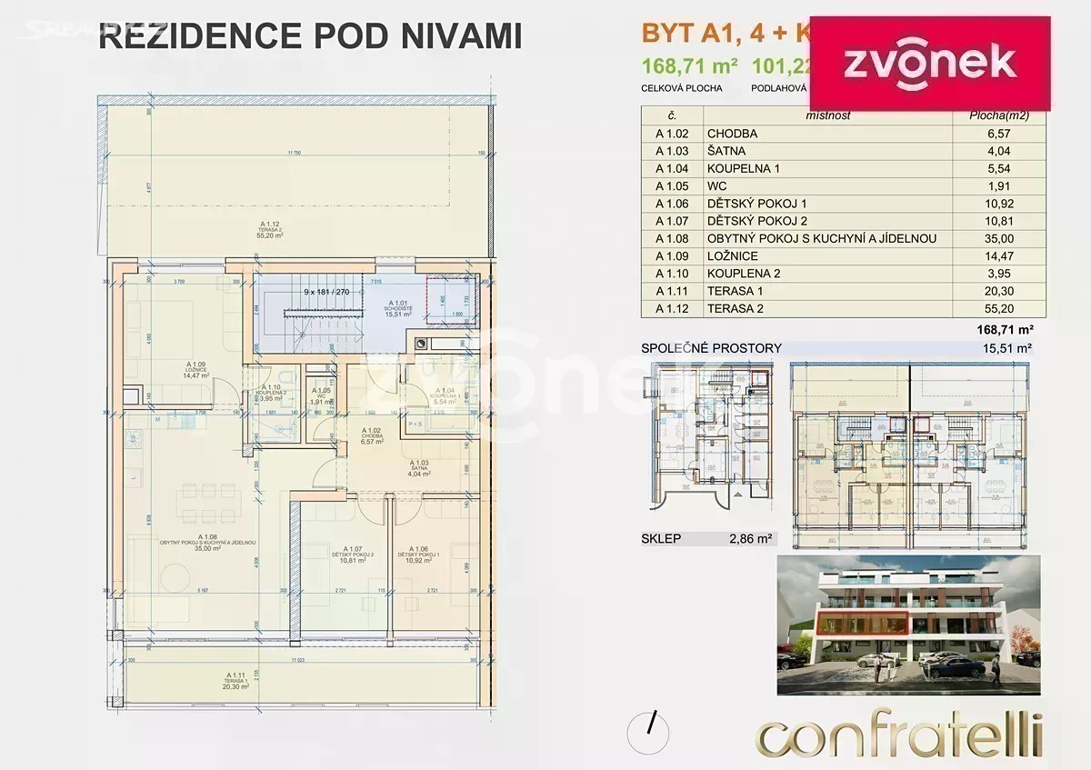 Nabízíme k prodeji byt 4+kk (A1) v 1. nadzemním podlaží Rodinného domu A, který vznikne v rámci mimořádného rezidenčního projektu REZIDENCE POD NIVAMI. Tento moderní byt se stane součástí exkluzivního projektu zahrnujícího pouze osm jednotek ve dvou rodinných domech, což zajistí pro obyvatele maximální soukromí a klidné bydlení. Byt se vyznačuje promyšlenou dispozicí, která splní očekávání i náročných klientů. Prostorný obývací pokoj s kuchyní a jídelnou, dvě rozlehlé terasy, tři ložnice, dvě koupelny, šatna a samostatné WC. K bytu dále náleží sklep. Prémiová lokalita v klidné ulici Pod Nivami kombinuje výhody bydlení v blízkosti centra Zlína s výbornou občanskou vybaveností - v pěší dostupnosti se nacházejí školy, školky, obchody, restaurace i zastávky MHD. K bytu je možné zakoupit parkovací stání nacházející se přímo před domem za cenu 400.000,- Kč. Byt bude součástí novostavby s plánovanou kolaudací na jaro 2027. V případě zájmu o více informací kontaktujte makléře. Využijte tuto jedinečnou příležitost - počet bytů je omezen!
