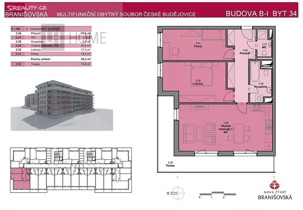 Druhá etapa projektu Nová čtvrť Branišovská B-I-II-III právě v prodeji! Představujeme vám jedinečnou příležitost bydlení, která kombinuje atraktivní lokalitu, moderní design a komfortní vybavení! Tento stylový byt 3+kk (84,3 m2) s terasou (19,9 m²) čeká na svého nového majitele ve 3. patře novostavby bytového domu B-I. Byt je navržen s důrazem na moderní styl a maximální funkčnost - perfektní volba pro jednotlivce, mladé páry nebo jako investiční příležitost. Součástí ceny je kvalitní standardní vybavení, které splní očekávání i náročnějšího zákazníka. Komfort, styl a dostupnost na jednom místě. Projekt nabízí celkem 225 bezbariérových bytů různých dispozic (od 1+kk po 4+kk). Všechny byty se pyšní balkónem, lodžií nebo terasou. K dispozici je i možnost zakoupení garážového parkovacího stání (od 390 000 Kč) nebo sklepa, který vám poskytne úložný prostor navíc. Harmonogram kolaudace a flexibilní financování: Kolaudace bytového domu je plánována na 4. čtvrtletí roku 2028. A co víc - nabízíme možnost družstevního bydlení, což je skvělá volba pro ty, kteří hledají flexibilní financování a snadnější cestu k vlastnímu bydlení. Neváhejte a kontaktujte nás ještě dnes! Rádi vám poskytneme více informací, poradíme s financováním nebo domluvíme osobní prohlídku. Nová čtvrť Branišovská - to je místo, kde se sny o bydlení stávají skutečností!