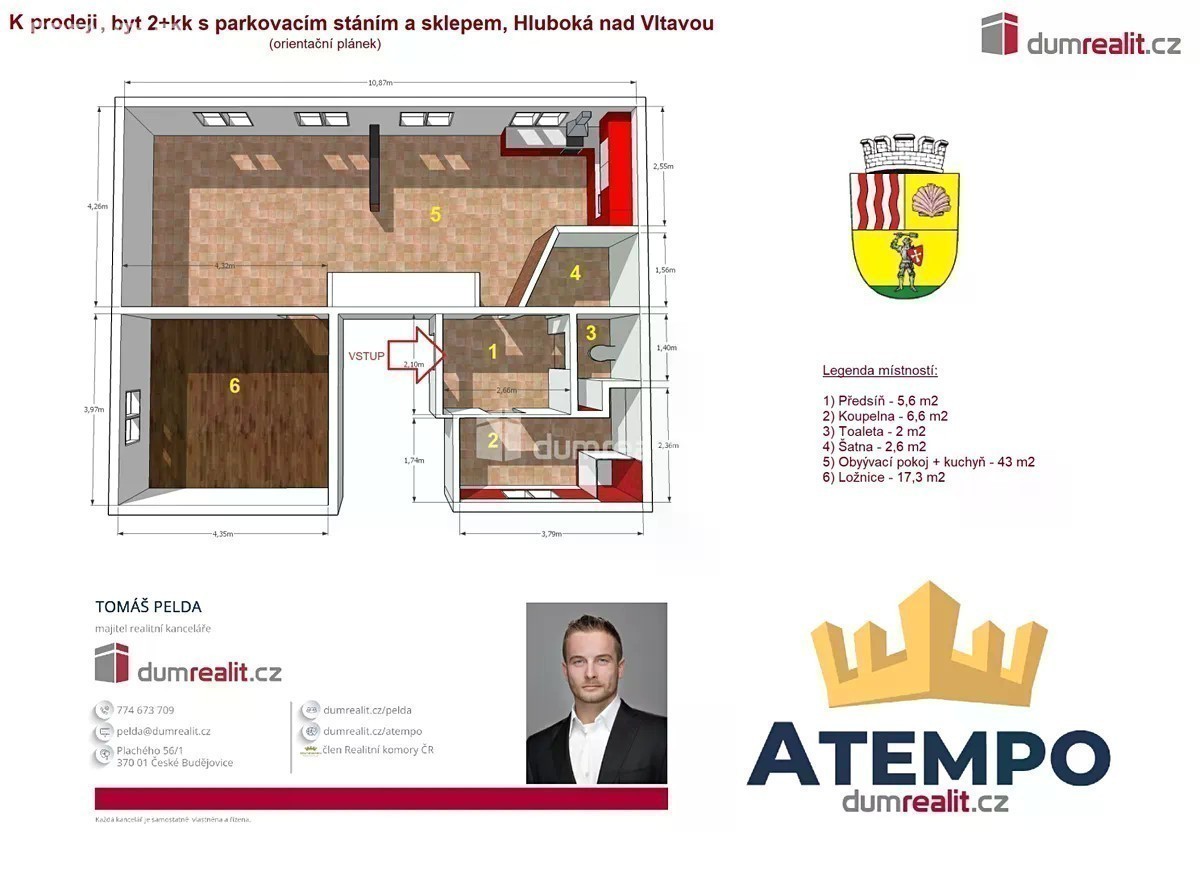 Naše společnost Vám zprostředkuje prodej bytu 2+kk, s možností úpravy dispozice na 3+kk, v cihlovém bytovém domě ve městě Hluboká nad Vltavou, ul. Třeboňská č.p. 213. Bytová jednotka o výměře 77 m² se nachází ve 2. patře a má výhled na věž státního hradu a zámku Hluboká nad Vltavou. Dispozice bytové jednotky naleznete na orientačním plánku mezi fotografiemi. K bytu náleží zděný sklep v přízemí domu. Součástí prodeje je parkovací stání přímo u domu. Bytová jednotka je momentálně dlouhodobě pronajata. Cena nájemného je 15.000,- Kč + poplatky 4.500,- Kč (elektřina a plyn, vodné-stočné, el. a úklid společných prostor). Doporučuji prohlídku, byt je v krásném stavu. Zajistíme Vám financování a veškerý právní servis. Více informací Vám poskytne realitní makléř Tomáš Pelda z realitní kanceláře A TEMPO fungující pod ochrannou známkou naše společnost. Těšíme se na prohlídce. Ev. číslo: 652260.