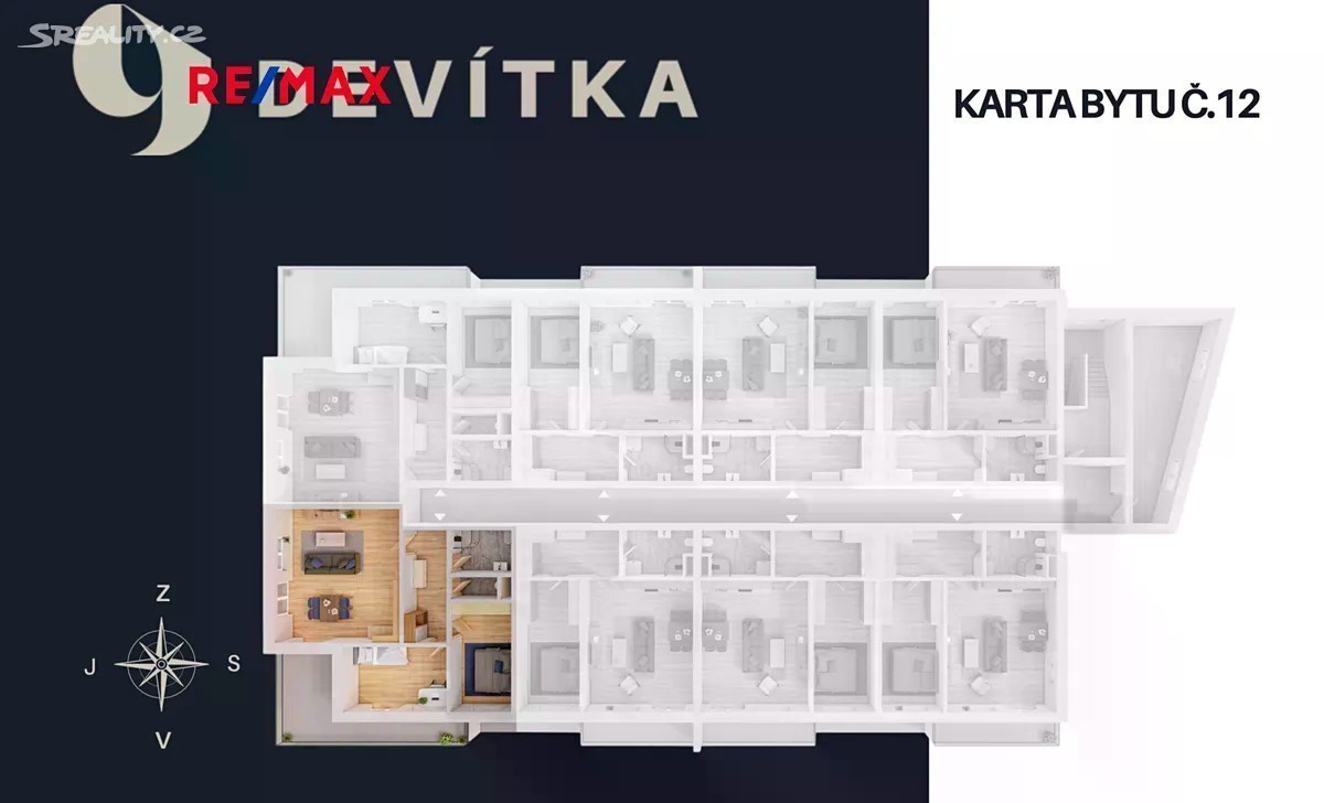 V ulici 9. května v Ševětíně vzniká moderní bytový dům s celkem 16 bytovými jednotkami, aktuálně ve fázi výstavby. Dokončení projektu je plánováno na 4. čtvrtletí roku 2026. Každý byt disponuje vlastním venkovním prostorem - terasou nebo zahradou, praktickým sklepem a komfortním parkovacím stáním přímo u domu. Představuji Vám exkluzivní nabídku prakticky řešené bytové jednotky č. 12 o dispozici 3KK s neprůchozími pokoji a terasou. Světlá a prostorný byt o celkové ploše 95,2 m² se nachází ve 2. nadzemním podlaží. Samotná obytná plocha činí 69,7 m² a zahrnuje prostorný obývací pokoj s kuchyňským koutem (30,2m²), ložnici (12,1 m²),pokoj (12,1m²), chodbu (8,8m²) a koupelnu (4,7m²), toaletu (1,8 m²), terasa 18,3m² Tento byt je navržen tak, aby poskytoval maximální pohodlí a praktičnost pro každodenní život. Dispozice bytu zahrnuje neprůchozí pokoje, což zajišťuje dostatek soukromí. Francouzské okno, které spojuje obývací prostor s terasou, nejen že opticky zvětšuje místnost, ale také do ní přivádí množství denního světla. Terasa orientovaná na jihovýchod se tak stává dokonalým místem pro relaxaci. Můžete zde vytvořit pohodlné posezení, užívat si výhled a sluneční paprsky bez starostí o údržbu zahrady. Vstupní předsíň bytu je dostatečně velká, aby poskytla prostor pro vestavěné skříně. Tak můžete efektivně uspořádat své věci a udržovat byt vždy uklizený a přehledný. V ložnici je také dostatek prostoru pro úložné systémy. Koupelna bytu je moderně zařízená a zahrnuje sprchový kout a je zde pamatováno i na místo vyhrazené pro pračku a sušičku, což ocení zejména ti, kdo preferují mít vše prakticky na dosah ruky. Byt je orientován na západ. Bytový dům je situován v klidné a zelené části Ševětína s veškerou občanskou vybaveností v pěší vzdálenosti - školka, škola, obchod, restaurace i lékař. Díky výbornému dopravnímu spojení autem, vlakem i autobusem se snadno a rychle dostanete do Českých Budějovic. Uvedená cena je včetně DPH. Veškeré možnosti financování Vám zajistíme. 3D model a grafika jsou pouze ilustrativní a nemusí odpovídat skutečnosti. Další informace naleznete na stránkách projektu Devítka. V případě zájmu o prohlídku nás neváhejte kontaktovat.