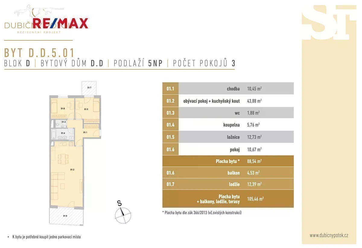 Zveme Vás na prohlídku úplně nového vzorového bytu vybaveného nábytkem Hanák. V rámci podzimní akce můžete získat vybavení k bytu v hodnotě 480 000 Kč i Vy (mimo bytů 1+kk). Den otevřených dveří pořádáme v sobotu 15. 11. 2025 formou skupinové prohlídky v 10:00 a 11:00 hodin. K dispozici také 10 bytů za akční cenu nebo bonus až 150 000 Kč při rychlém jednání. Bonusy a slevy nelze kombinovat. Tento byt je nyní za zvýhodněnou cenu! Společně s dalšími vybranými jednotkami jsme ho zařadili do speciální akce - uvedená cena je již po slevě. Získejte nový, moderní byt v projektu Dubičný potok a užijte si všechny jeho nadstandardní výhody. Představuji Vám exkluzivní nabídku bytové jednotky (D.D.5.01) v rezidenci Dubičný Potok v Českých Budějovicích. Najdete ho spolu s dalšími na našich stránkách, kde si v "Nabídce bytů" nebo "Ceníku" můžete všechny byty velmi komfortně prohlédnout. Tento moderně řešený byt 3+kk o celkové výměře 105,46 m2 vás nadchne svým komfortem a unikátním životním stylem. Dispozice: vstupní chodba otevírá vstup do všech neprůchozích pokojů. Ložnice se pyšní vlastním balkónem o výměře 4,53 m2. Co oceníte je koupelna s dvěma umyvadly. Velkolepý prostor obývacího pokoje s kuchyňským koutem je prosvětlen lodžií o výměře 12,39 m2. Plocha interiéru 88,54 m2 se rázem zvětšuje o venkovní prostory, kde si vytvoříte svou odpočinkovou zónu na čerstvém vzduchu s výhledem do zeleného prostředí. Výhody rezidence: Rezidence Dubičný Potok nabízí široké spektrum vybavení pro pohodlný životní styl a aktivní volný čas. Na dosah ruky je dětské hřiště, workout pro dospělé, grilovací zóna, hřiště na petang, 24/7 fitness a mnoho dalšího. Atrium plné zeleně, vodní plocha s naučnou stezkou a přírodní hřiště pro děti vytvářejí ideální prostředí pro odpočinek a relaxaci. Dopravní dostupnost a parkování: S výbornou dopravní dostupností bude váš každodenní život pohodlný. Zastávka MHD přímo před objektem vám umožní snadný přístup do centra města, kam se dostanete i na koloběžce za pouhých 5 minut. Pro vaše vozidlo je k dispozici parkování v podzemním parkovišti s teplotou stabilní po celý rok. Parkovací stání není součást ceny, je potřeba zakoupit zvlášť. Obchodní jednotky: Přízemí rezidence nabídne množství obchodních jednotek, které poskytnou veškeré potřebné služby na dosah vašeho bydlení. V parteru budou umístěny např. drobné potraviny, kavárna a obchůdky. Objekt je vytápěn přes teplárnu, která používá české uhlí a navíc je napojen na elektrárnu Temelín, ze které z části odebírá zbytkové teplo. Byt je k okamžitému nastěhování. Veškeré možnosti financování vám zajistíme ve spolupráci s naším finančním oddělením. Fotografie bytu byly pořízeny na vzorovém bytě 3kk.