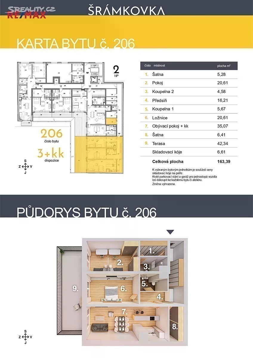 V projektu Šrámkovka nabízíme poslední volné byty: 2x 3kk, 1x 4kk a 1x střešní Penthouse. Součástí nabídky je byt s číslem 205. Toto velkoryse pojaté 3+kk nabízí svým rozměrem plochu rodinného domu. Při vstupu vejdete do obří předsíně/šatny, jejíž velikosti je neuvěřitelných 18 m2. U pokoje je další místnost, která může být využívána jako walk-in šatna, pracovna, posilovna. Obývací pokoj s kuchyňskou linkou a praktickou spíží svou velikostí atakuje byt 1+kk. Hlavní ložnice je na opačné straně bytu a poskytuje maximální soukromí. Má walk-in šatnu, přes kterou se vchází do vlastní koupelny. Další, velká koupelna je umístěna v centrální části bytu. Třešínkou na dortu je jednoznačně veliká terasa do tvaru L, jež je z části přestřešená a nabízí velkorysý prostor pro venkovní odpočinek. Výhled a vstup je na ni ze všech obytných místností buď přes francouzská okna nebo posuvné okno (hliníkový HS portál), na kterých jsou instalovány venkovní žaluzie. Byt je orientovaný na jih a západ směrem do vnitrobloku. V ceně je skladovací kóje umístěná na patře. K bytu lze přikoupit jedno parkovací stání v prvním nadzemním podlaží a uzamykatelnou garáž pro jednostopá vozidla umístěnou ve vnitrobloku. Bytový dům je ve fázi výstavby a vzniká v něm celkem 20 bytů, přičemž volné máme již jen poslední 4. Předání je plánováno na květen roku 2026. Standardy: Dřevěné dubové podlahy Vnitřní dveře značky SAPELI model Elegant Komfort Rozetové kliky FO-NAXOS-HR Dlažby a obklady zn. RAKO Nábytková umyvadla Sapho Kare, baterie Hansgrohe Vernis Sprchové zástěny zn. Hűppe, sanita zn. Hansgrohe Součástí prohlídky je i návštěva plně vybaveného vzorového bytu, kde si veškeré standardy, které jsou v ceně bytů, můžete prohlédnout Bytový dům se nachází v blízkosti centra města se snadným přístupem k bohaté občanské vybavenosti. Zároveň díky zahradě umístěné do vnitrobloku poskytne svým obyvatelům klidné a tiché prostředí pro relaxaci. V bezprostřední blízkosti se nachází MŠ, ZŠ, SŠ a gymnázia, vlakové i autobusové nádraží. K největšímu jihočeskému OC IGY dojdete za 5 minut, dětské hřiště za rohem. 200 m od domu se nachází Palackého náměstí. Na dálnici D3 jste za pouhých 5 minut. Samotná ulice a její okolí je přitom velice poklidná a dopravně nevytížená. 10 TOP projektu • Velké rozměry místností • Nadstandardní velikost balkonů a teras • Spousta úložných prostor • Prostorné sklady k bytům na patře • Podlahové vytápění • Posuvná francouzská okna s HS portály • Předokenní žaluzie • Příprava na klimatizaci • Prostorná krytá parkovací místa a uzavřené garáže pro jednostopá vozidla • Zelená zahrada Uvedená cena je včetně DPH. Výměry místností naleznete na přiloženém půdorysu. 3D model a grafika jsou pouze ilustrativní a nemusí odpovídat skutečnosti. Fotografie byly pořízeny na vzorovém bytě 3kk číslo 202. Další informace na stránkách projektu.