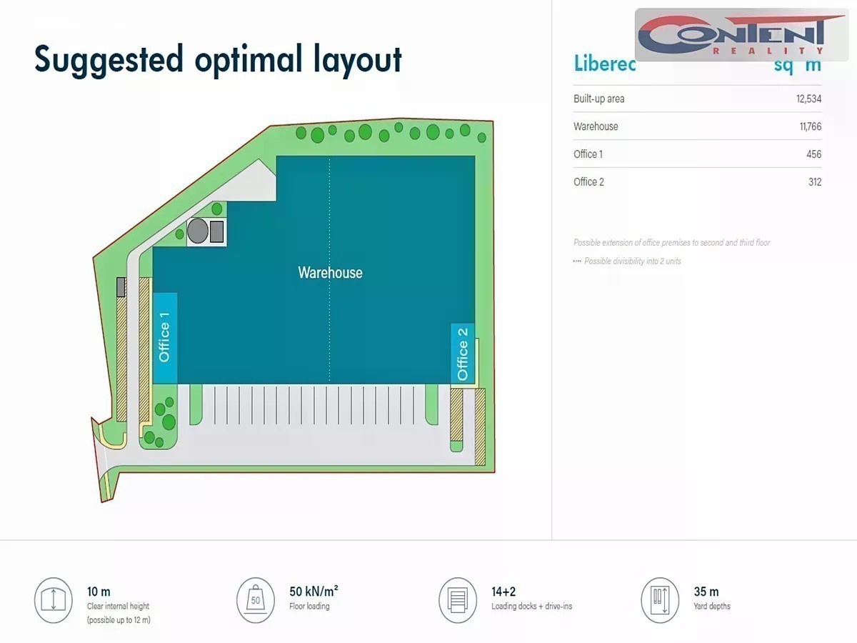 Pronájem skladu, výrobních prostor Liberec. V zastoupení majitele a bez provize nabízíme skladové nebo výrobních prostory o velikosti 12534 m² s moderními prvky, umístěné v nově vznikajícím areálu v již zaběhlé průmyslové zóně v Liberci, nedaleko dálnice D10. - k výstavbě (BTS), stavební povolení vydáno, - k dispozici 8-12 měsíců od podpisu smlouvy, - možnost dělení na polovinu, - světlá výška 10 m, - nosnost podlahy minimálně 5 t/m², - 14x hydraulická rampa, 2x přímý vjezd, - LED osvětlení, - kancelářské a sociální zázemí na míru, - příprava na nabíjení elektromobilů v areálu, - dostatečné parkovací plochy i okolní zeleň Cena bude stanovena dle dalších požadavků individuálně. Fotografie jsou pouze ilustrační. Pro více informací nás kontaktujte, rádi zodpovíme Vaše dotazy.