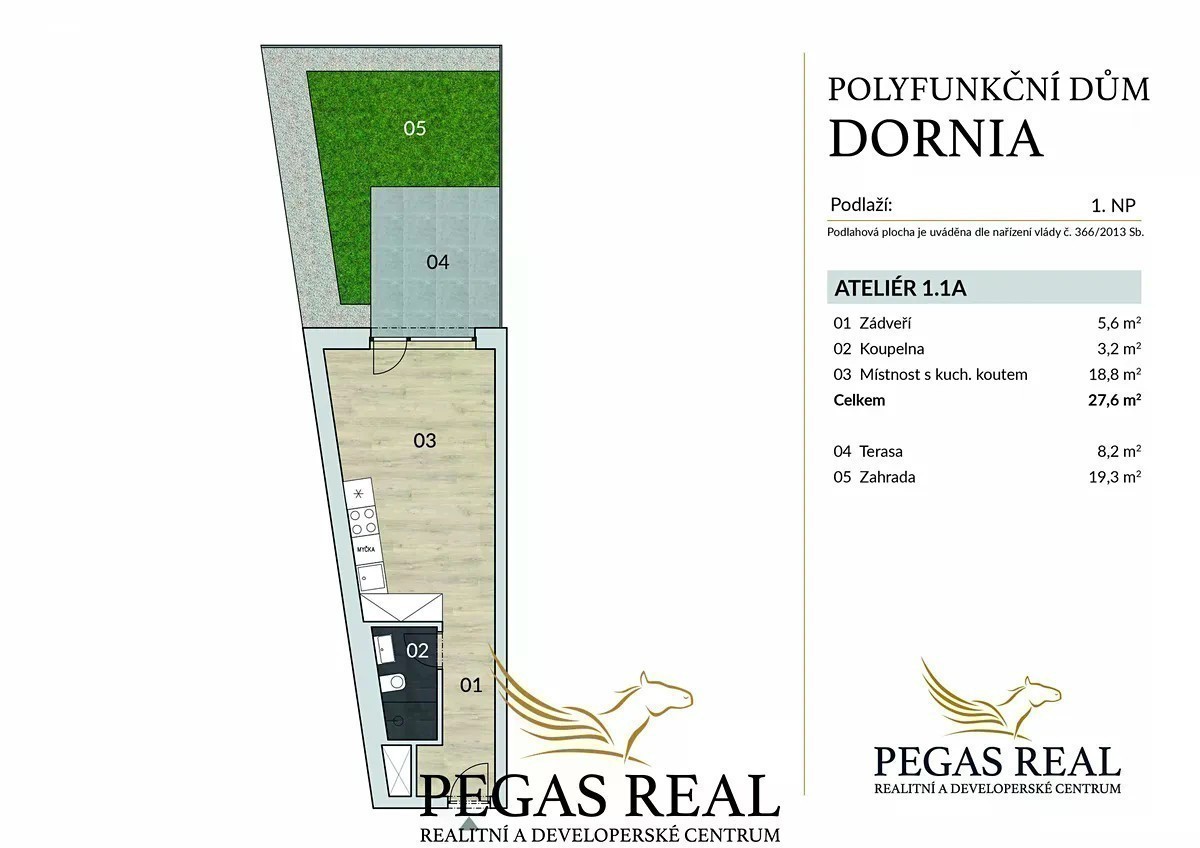 Zkolaudováno! Podívejte se náš vzorový byt jak na fotografiích, ve 3D scanu tak osobně. Ideální investiční příležitost k pronájmu! Centrum Brna, přitom klidný vnitroblok! Veškerá občanská vybavenost na dosah ruky! Jednotka nacházející se v novostavbě polyfunkčního domu! K dispozici parkování! Nabízím k prodeji ateliér (aktuálně rekolaudujeme na byt), který je umístěn v novostavbě polyfunkčního domu DORNIA, ve dvorním traktu ul. Dornych. Dům disponuje 6ti nadzemními a jedním podzemním podlažím. Orientace domu je východ - západ, což zajišťuje bohatou prosluněnost veškerých jednotek. Strategická poloha tohoto projektu je ideální příležitostí k pořízení investiční nemovitosti. V dochází vzdálenosti je centrum města, OC Vaňkovka a bezpočet společnosti zaměstnávající velké množství pracujících, což je ideální příležitost možných pronájmů za velmi výhodné ceny. Nabízený byt se nachází v 1NP domu. Výměra bytu činí 30m2. K jednotce náleží prostorná zahrada + terasa s výměrou více než 22m2, která Vám poskytne dostatečný prostor k příjemnému posezení i výrazně rozšíří užitnou plochu. Byt je velmi prakticky a funkčně řešen. Ze zádveří vstoupíte do koupeny se sprchovým koutem a toaletou a do obytné části s prostorem pro kuchyňský kout. Na obytnou část navazuje prostorná terasa. Plocha bytu 29,8m2 + zahrada a terasa 22,1m2. V objektu je realizováno 122 bytů a ateliérů s dispozičním řešením 1KK - 2KK. Většina jednotek disponuje balkónem či terasou. Možné dokoupení sklení kóje. Jednotka i celý projekt polyfunkčního domu jsou provedeny ve vysokém standardu. V domě je k dispozici výtah. Dům je dokončen. Postup při koupi: - po podpisu Rezervační smlouvy, úhrada rezervační zálohy - podpis Smlouvy o smlouvě budoucí - úhrada kupní, ceny, kolaudace, podpis Kupní smlouvy - po úhradě kupní ceny a podpisu Kupní smlouvy dochází k převodu vlastnického práva na Katastru nemovitosti s následným fyzickým předáním jednotky kupujícímu S financováním Vám velmi rádi pomůžeme. Možno financovat hypotečním úvěrem. S financováním Vám velmi rádi pomůžeme. V případě investičního záměru Vám zajistíme vhodného nájemníka. Předpokládaný měsíční výnos z nájmu 15.500Kč + náklady na služby. Jednotka může být v případě zájmu předána kompletně vybavená nábytkem /několik cenových variant/. Cena sklepní kóje 100.000,- Kč. Jsem přesvědčen, že Vás tato ojedinělá nabídka bytů a ateliérů osloví. Velmi rád se Vámi setkám osobně a můžeme společně probrat podrobnosti celého projetu a detaily dalších nabízených jednotek projektu DORNIA.