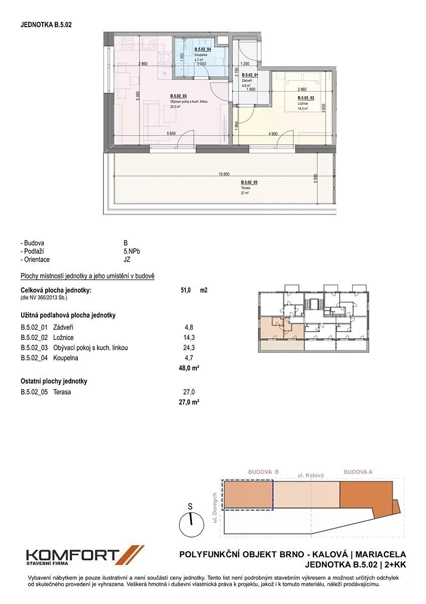 Rezidence Mariacela - Vaše komfortní bydlení poblíž nového Jižního centra Brna, v oblasti s dynamickým rozvojem, v bezprostřední blízkosti nového hlavního nádraží a parku Mariacela. Mariacela roste na nároží ulic Dornych a Kalová, Brno. Jedná se o moderní polyfunkční projekt, který spojuje inovativní technologie s pohodlím domova. Díky chytré domácnosti, rekuperaci vzduchu a chlazeným stropům nabízí zdravé a komfortní bydlení po celý rok. Mariacela znamená nejen nižší náklady, ale i dlouhodobě udržitelné bydlení s energetickým štítkem A. Celkem 86 exkluzivních jednotek různých dispozic s balkonem, lodžií či terasou, umístěných v 1.až 9.nadzemním podlaží. Horní patra umožňují krásný výhled na brněnské dominanty. Naopak v přízemí domu je navženo 7 komerčních prostor určených pro obchody či služby. V podzemních patrech, kam vás pohodlně doveze výtah, se pak nachází: - GARÁŽOVÁ STÁNÍ v ceně od 800.000,-Kč, pohodlný vjezd/výjezd zajišťují automatická sekční garážová vrata. V hromadné garáži - příprava na wallbox (el.nabíjení aut) - SKLEPY různých velikostí přístupné i přímo z garážových stání. Výběr sklepu je na kupujícím, cena sklepu není součástí ceny jednotky. Výstavba Rezidence Mariacela zahájena v I.Q/2025, termín dokončení ve IV.Q/2027. Rádi Vám poskytneme podrobnější informace nebo se podívejte na webové stránky projektu rezidencemariacela.