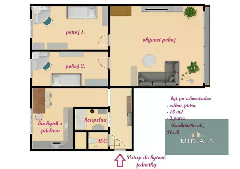 Dovolujeme si nabídnout prodej bytové jednotky v osobním vlastnictví, umístěné v okrajové části města Plzně, v Bolevci, konkrétně v Manětínské ulici. Jedná se dispozičně o 3+1 ve 3.patře panelového domu, celková výměra je 70m2. Byt prošel rekonstrukcí rozvodů, je zde zděné jádro, součástí rekonstrukce bylo také zvětšení obývacího pokoje o převážnou část lodžie, čímž vznikla krásně prostorná místnost s francouzskými dveřmi podél celé stěny, směřující na východ. Z lodžie se v tu chvíli stal prostor na umístění květináčů poskytující výhled do vnitrobloku. Na části stropu jsou sádrokartonové podhledy. Na míru dělaná kuchyně od truhláře se pyšní novými vestavnými spotřebiči - lednička s mrazákem, elektrická trouba, indukční varná deska, digestoř. Také zde zůstává mikrovlnná trouba a pračka se sušičkou - ta je prakticky schovaná v jedné ze skříněk v kuchyni. Jídelní stůl se židlemi jsou taktéž součástí prodeje. V koupelně je vana a koupelnová skříňka s umyvadlem, a skříňka na zdi. WC samostatné. Dva zbylé pokoje jsou také samostatné, s okny směřujícími na západ. Podlahová krytina je kvalitní vinyl- v chodbě, kuchyni a obývacím pokoji, dále dlažba - v koupelně a WC, koberce v pokojích. Součástí prodeje je vlastní sklepní kóje umístěná v suterénu a také podíl na společných částech panelového domu. Ten prošel revitalizací, při které došlo k výměně všech oken za plastová, zateplením a také obnovou výtahu a společných prostor. V této lokalitě je převážně bezproblémové parkování u domu. Tato lokalita je ideální pro rodinu s dětmi, naproti domu je lesopark, který láká k procházkám, pěší chůzí se dostanete k vyhlášenému rybníku Šídlovák, nedaleko je tramvajová zastávka, ale také nákupní centrum a veškerá další občanská vybavenost na kterou si vzpomenete. Správcem domu je Plzeňský servis s.r.o. Měsíční platba do SVJ je ve výši 5.300,- Kč - počítáno se zálohami na dva dospělé a dvě děti, a zahrnuje vodné, stočné, dálkové topení, TKO, společné prostory, servis, režie, a také fond oprav. Další platbou je pouze spotřeba elektrické energie, plyn je zde odpojen. Doporučuji prohlídku této nemovitosti, která je k zarezervování připravena ihned. Cena je včetně realitního servisu, právních služeb i zajistíme výhodné financování na míru. Více info u makléře dané nemovitosti.