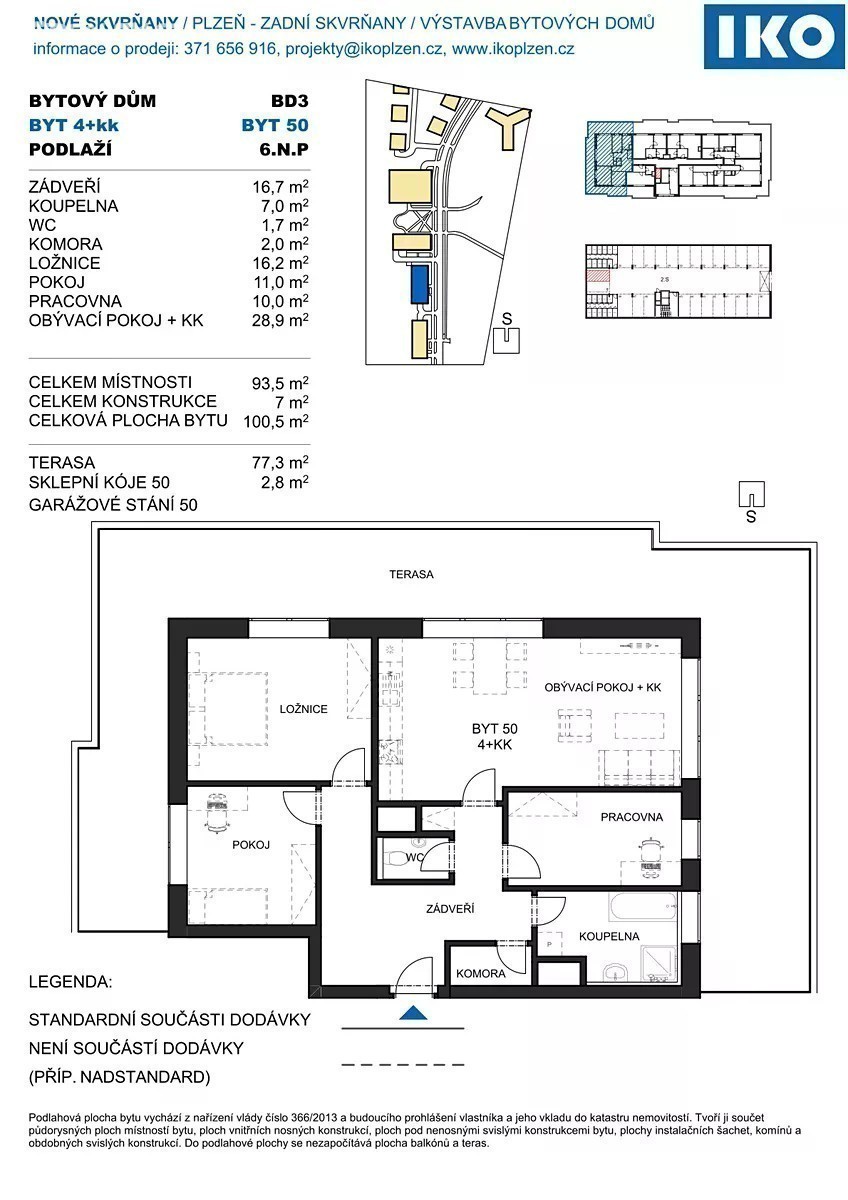 Nabízíme Vám k prodeji moderní velkoprostorový byt 4+KK č. 50 o celkové ploše 100,5 m² v právě realizovaném projektu Nové Skvrňany v Plzni s EXKLUZIVNÍM výhledem. Byt se nachází v posledním 6. nadzemním podlaží novostavby bytového domu 03 a je ideální volbou pro vlastní bydlení, které nabízí maximální soukromí v podobě posledního patra a luxus spojený s velkou terasou 77 m2. Byt je možné si v průběhu výstavby upravit dle svého vkusu v podobě klientských změn. V projektu máme i další byty 4+KK v různých patrech a o rozdílných velikostech. Informujte se o dalších volných bytech na našem prodejním WEBU. Dispozice a vybavení: - prostorný obývací pokoj s kuchyňským koutem - tři samostatné ložnice - koupelna s vanou, sprchovým koutem a oknem na terasu bytu - samostatné WC - praktická technická místnost (komora) - vstupní chodba s místem pro úložné prostory - ohromná terasa o výměře 77 m2, orientovaná na všechny strany bytu - východ, jih, západ. Na terasu mají výstupy všechny obytné místnosti - sklepní kóje v ceně bytu - parkovací stání v podzemních podlažích Standardy bytu: - kvalitní podlahové krytiny, dveře, obklady a dlažby ve standardu bytu - příprava na kuchyňskou linku - příprava na klimatizaci - moderní okna s izolačním trojsklem a zateplená fasáda - 2 výtahy v domě - datové rozvody do všech obytných místností ve standardu - energeticky úsporný dům (třída B) Výhody: - novostavba bez nutnosti dalších investic - nízké provozní náklady - vhodné i na pronájem - realizace od renomovaného lokálního developera s dobrými referencemi - možnost provedení klientských změn v průběhu výstavby - prodej bez prostředníků - celou dobu jednáte výhradně s námi Lokalita: BYTOVÝ DŮM 03 bude vybudován v rámci výstavby lokality NOVÉ SKVRŇANY v docházkové vzdálenosti cca 200 m od konečné tramvaje č. 2 v Zadních Skvrňanech. V docházkové vzdálenosti najdete veškerou občanskou vybavenost - školy, školky, obchody, sportovní i volnočasová zařízení a zastávky MHD. Příjezd k bytovému domu bude zajištěn prodloužením ulice Františka Kováříka. Nespornou výhodou je též napojení na nově vybudovaný západní obchvat Plzně. Jedná se o 8 podlažní objekt. V 1. a 2. PP jsou umístěna krytá parkovací stání a sklepní kóje. Současně jsou zde prostory pro umístění el. rozvaděčů a slaboproudých rozvodů. Objekt bude napojen na rozvody Plzeňské teplárenské a.s. Propojení podzemních podlaží s nadzemními je zajištěno 2 výtahy. V 1. až 6. NP se nachází celkem 51 bytových jednotek s dispozičním uspořádáním 1+kk, 2+kk, 3+kk a 4+kk s podlahovou plochou 30,1 m² - 119,7 m². Součástí bytů jsou též balkony a v posledním 6. NP velké terasy.