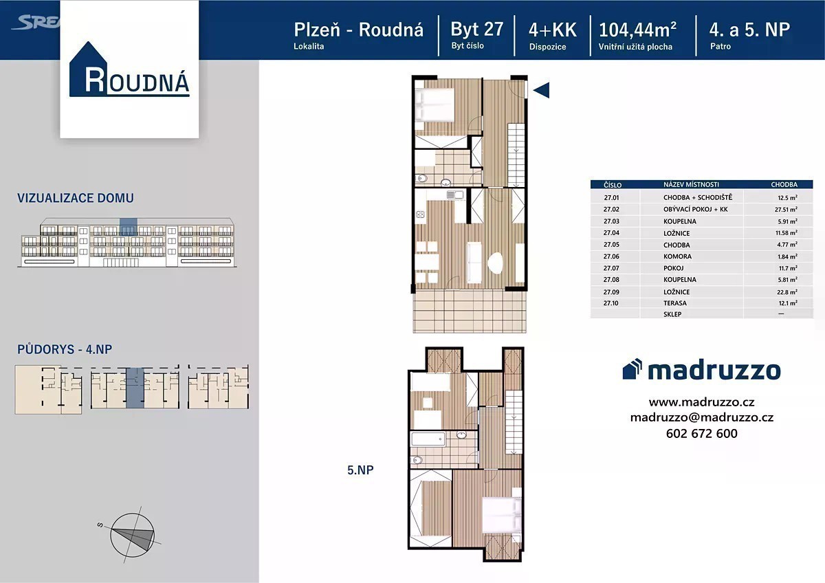 Klidné bydlení kousek od centra Plzně. Projekt Byty Roudná nabízí ideální kombinaci městského života a klidu přírody. Stačí pár minut chůze a jste v centru Plzně, ale doma vás čeká ticho, zeleň a příjemná atmosféra rezidenční čtvrti. Soubor Byty Roudná tvoří celkem 32 bytů různých velikostí a dispozic a 4 nebytové prostory. Každý byt má terasu, lodžii nebo předzahrádku, a projekt klade důraz na kvalitní materiály i citlivé zasazení do okolní zástavby. K bytovému domu vede přístup z méně frekventované ulice Na Roudné, která ovšem navazuje na hlavní tah, a tak umožuje dobrou dopravní dostupnost po Plzni a do dalších měst. Nyní je v prodeji mezonetový byt o dispozici 4+kk a velikosti 104 m² s prostornou terasou 12 m², umístěný ve 4. a 5. nadzemním podlaží. Byt je ideální pro rodiny i páry, které hledají dostatek prostoru a pohodlí. Součástí bytu jsou 2 vnitřní parkovací stání a sklepní kóje. Roudná je dnes moderní a vyhledávaná část Plzně s kompletní občanskou vybaveností - najdete tu obchodní centrum Rondel, sportoviště, školu i školku. A když budete chtít na čerstvý vzduch, Bolevák je jen kousek odsud. Bydlete pohodlně v centru dění, ale v klidu a zeleni. S financováním vám rádi pomůžeme - ozvěte se nám a domluvme si osobní schůzku.