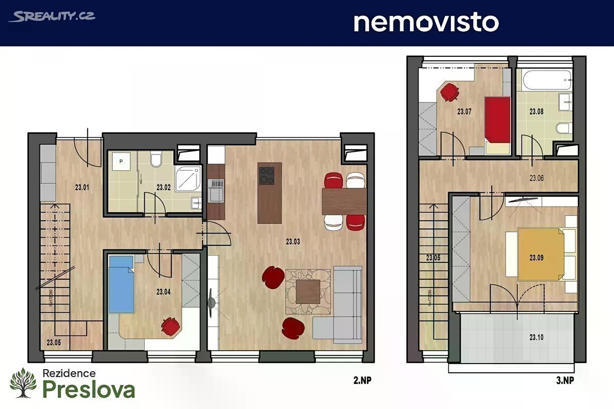 Poslední nové byty NA PRODEJ v developerském projektu Rezidence Preslova, který se nachází v centru Ostravy u parku Komenského sady. Zažijte prostor, komfort a bezpečí. Hlavní výhody projektu: - máme zkolaudováno = nastěhování ihned - dřevěná okna s trojskly a venkovními žaluziemi - kvalitní dřevěná podlaha a keramická dlažba - komfortní podlahové vytápění s termostatem - možno dokoupit garážové stání a sklep Rodinná bytová jednotka č. 23. Byt typu mezonet, je umístěný do 4. NP a pátého nadzemního podlaží. Celková podlahová plocha 113 m2 nabídne obývací pokoj s kuchyní o výměře 36 m2. Užívejte si nadstandardní komfort a prostor. Celkem tři pokoje. Dva pokoje o výměře 9 m2 a ložnice s výměrou 16 m2. Podlahové vytápění má ovládání v každé místnosti. Byt má dvě koupelny. Ve spodním podlaží koupelna se sprchovým koutem a toaletou. V horním patře koupelna s vanou a toaletou. Maximální soukromí díky elektricky ovládaným venkovním žaluziím. Rezidence nabízí podzemní parkování, garážové stání je možno dokoupit za cenu 429.900,- vč. DPH. Zakoupit si můžete také prostorný sklep. Vše potřebné od obchodů, restaurací, zdravotního střediska nebo koníčků pro děti máte v docházkové vzdálenosti. Tenisové kurty, sportoviště, Komenského sady, vnitřní bazén i venkovní koupaliště pouhých 5 minut chůze od domu. V okolí se nachází prestižní 1st International School of Ostrava, základní i mateřská škola, vyhlášené Matiční gymnázium a Ostravská univerzita. Kontaktujte výhradního prodejce, společnost NEMOVISTO a domluvte si osobní prohlídku bytů ještě dnes.