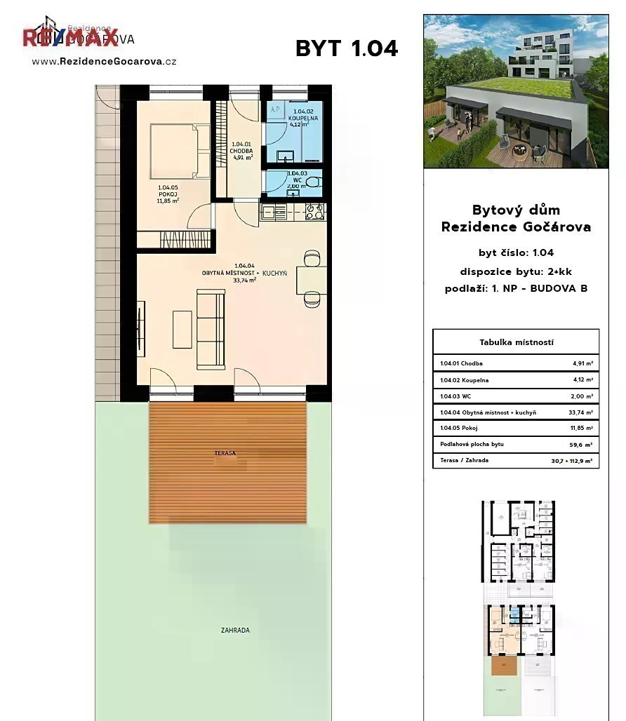 Nový bytový projekt Rezidence Gočárova - DOKONČENO - ihned k nastěhování Ve výhradním zastoupení naší společností RE/MAX Future, Vám tímto nabízíme ke koupi nadstandardní bytovou jednotku se zahradou v rámci dokončeného bytového projektu Rezidence Gočárova, nacházejícího se na adrese, ze které je to všude blízko - Gočárova třída, Hradec Králové - naproti OC Aupark. Byt číslo 105 o dispozici 2+kk (59,4 m²), s celkovou plochou k užívání 188 m², je umístěn v zeleném vnitrobloku bytového domu. Pyšnit se může 25,3 m² velikou terasou, která plynule navazuje na vlastní soukromou zahradu o výměře 96 m², na které můžete příjemně relaxovat, grilovat a užívat si zeleného vnitrobloku. Vzhledem k tomu, že se nacházíme v atraktivní části města, je jakákoliv možnost vlastnictví zahrady se zelení poměrně vzácná. Dispozičně tento byt sestává z chodby, obytné místnosti s kuchyňským koutem a vstupem na terasu, ložnice, koupelny se sprchovým koutem a samostatné toalety. K bytu rovněž náleží sklep o velikosti 7,3 m². Moderní bytový dům o 15 samostatných jednotkách je postaven s důrazem na kvalitní materiály, ekonomický provoz, moderní technologie a udržitelnost spojenou s obnovitelnými zdroji energie. Toto spojení dohromady vytváří nadstandardní bydlení zohledňující potřeby moderně smýšlejících lidí všech věkových kategorií. Masivní dřevěné podlahy, velkoformátová dlažba a obklady v koupelně, podlahové vytápění, vnitřní sádrové omítky, bezpečnostní pětibodové vstupní dveře, tablet sloužící jako domovní videotelefon, datové připojení optickými kabely až do bytů, … O klid v bytech a perfektní tepelnou izolaci se zaslouží i plastová okna s izolačními trojskly, systémem přirozené cirkulace vzduchu a nadstandardním protihlukovým útlumem. Všechna okna bytu jsou osazena venkovními el. ovládanými žaluziemi. PENB s klasifikační třídou B - velmi úsporná. K bytům lze pořídit za zvýhodněnou cenu až 3 parkovací stání umístěné přímo v 1.PP domu. Pohodlnou obslužnost všech podlaží zajišťuje designový prosklený výtah. Více informací o bytovém domě naleznete na webových stránkách projektu RezidenceGocarova. Pro sjednání prohlídky prosím kontaktujte makléře nabídky - Jiří Samek - výhradní prodejce.