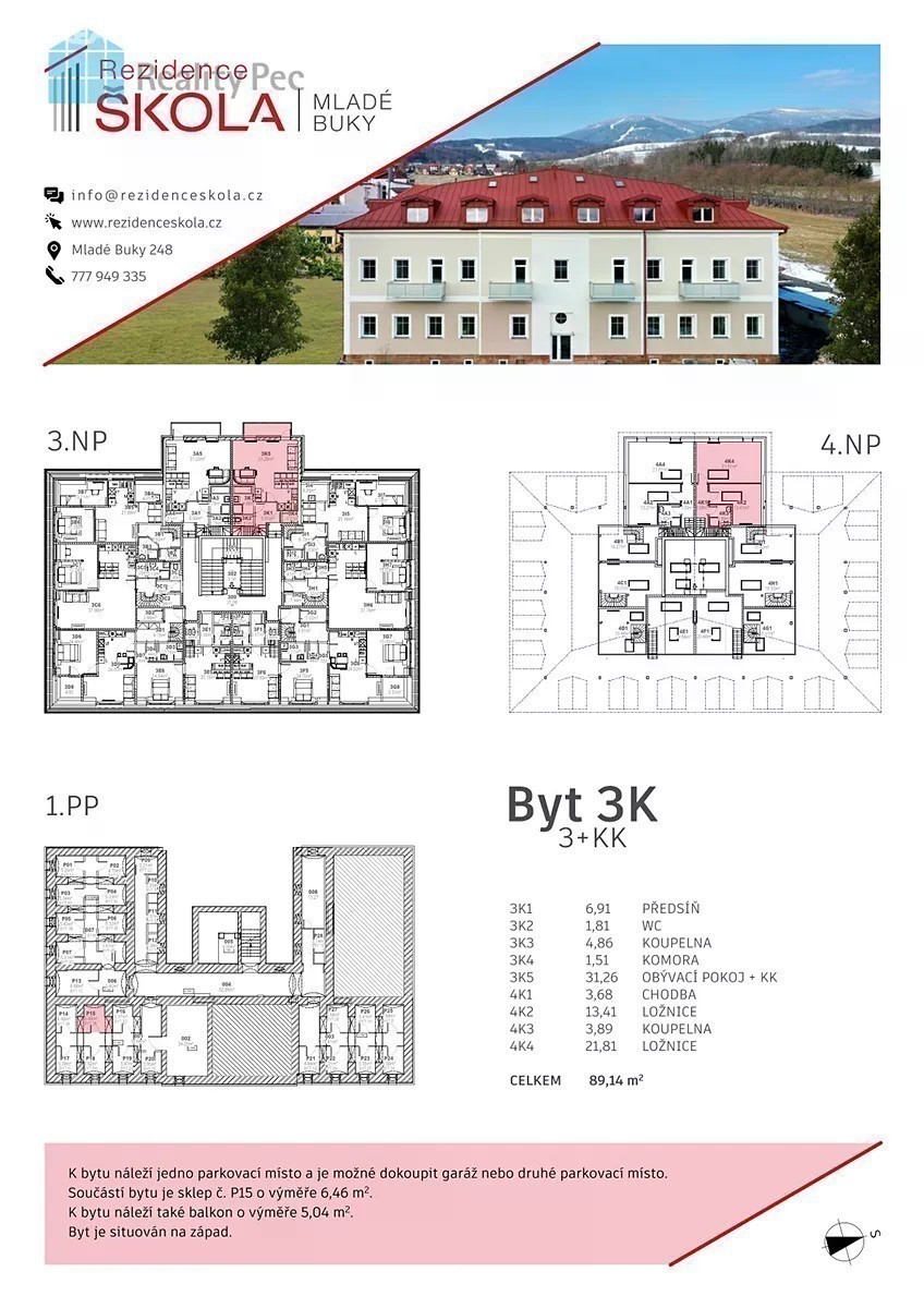 Exkluzivně nabízíme prodej bytu 3+kk s užitnou plochou 89,14m2 byt se nachází v moderním rezidenčním projektu v centru obce Mladé Buky. Nově zrekonstruovaná budova "staré školy" se přeměnila na bytový dům s 28 byty. Dům s výtahem zajišťuje pohodlné bydlení pro všechny věkové skupiny. Díky kvalitnímu provedení a nízkým nákladům na provoz nabízí ideální podmínky pro každodenní život. Byt je navržen s důrazem na komfort a funkčnost. Byt se nachází v 3.NP, mezonet do 4.NP orientovaným na západ. K bytu náleží balkón o výměře 5,04m2. Parkovací stání a sklepní kóje jsou samozřejmostí. Nabízí se i možnost dokoupení garáže nebo druhého parkovacího místa. Atraktivní lokalita a vysoká poptávka po ubytování zaručují výhodnou investici. Byty jsou ideální pro trvalé bydlení, dlouhodobý pronájem či rekreační využití, což umožňuje stabilní a ziskové příjmy. Mladé Buky jsou malebnou obcí s výjimečnou polohou mezi městem Trutnov a horskými středisky Krkonoš. Pouhých 15 minut od Trutnova a 20 minut od Pece pod Sněžkou nabízí snadný přístup ke všem potřebným službám, stejně jako k lyžařským areálům, turistickým trasám či golfovému hřišti. V bezprostřední blízkosti se nachází nejen přírodní krásy, ale i široká škála volnočasových aktivit. Mladé Buky jsou ideálním místem pro klidný život, rekreaci i aktivní odpočinek. Neváhejte nás kontaktovat pro více informací či prohlídku bytu.