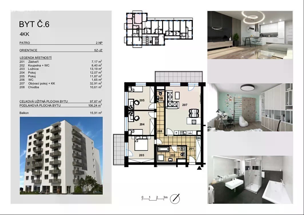 Nabízíme prodej nových a moderních bytových jednotek, a to v projektu na ulici Okružní, které jsou téměř luxusní svoji velikostí a technologiemi. Bytový dům nabízí jak bytové jednotky od dispozic 1+kk po 4+kk, tak i nebytové prostory v 1.NP. Tato konkrétní bytová jednotka o dispozici 4+kk, se nachází ve 2.np/8np. nově zbudovaného bytového domu s výtahem a je v projektu označena jako jednotka 1.B6. Plocha tohoto bytu činí 106,24 m2, dále k němu náleží příslušenství, jakožto dva balkóny (9,68 m2 a 6,21 m2) a sklepní prostor přímo na patře o výměře 2,65 m2. Společným rysem všech bytů je plocha nadstandardních rozměrů, praktické dispoziční řešení, kvalitní vinylové podlahy, rekuperační jednotky na údržbu čistého, svěžího vzduchu v bytech a jiné velkorysé zařizovací předměty či podlahové teplovodní vytápění. Byly vybrány technologické prvky a materiál tak, abychom potřeby zákazníka vedli k maximální spokojenosti. K bytu je možno dokoupit 1 parkovací stání. Projekt je aktuálně těsně před kompletním dokončením a kolaudace celého domu proběhne 1.polovině roku 2025. Výhodou je také lokalita, která nabízí veškeré poptávané služby a vybavenost včetně skvělé dojezdnosti díky dálnici D1. Pro účely tohoto projektu vám rádi zajistíme financování pomocí zvýhodněného hypotečního úvěru. Pro více informací o projektu kontaktujte makléře.
