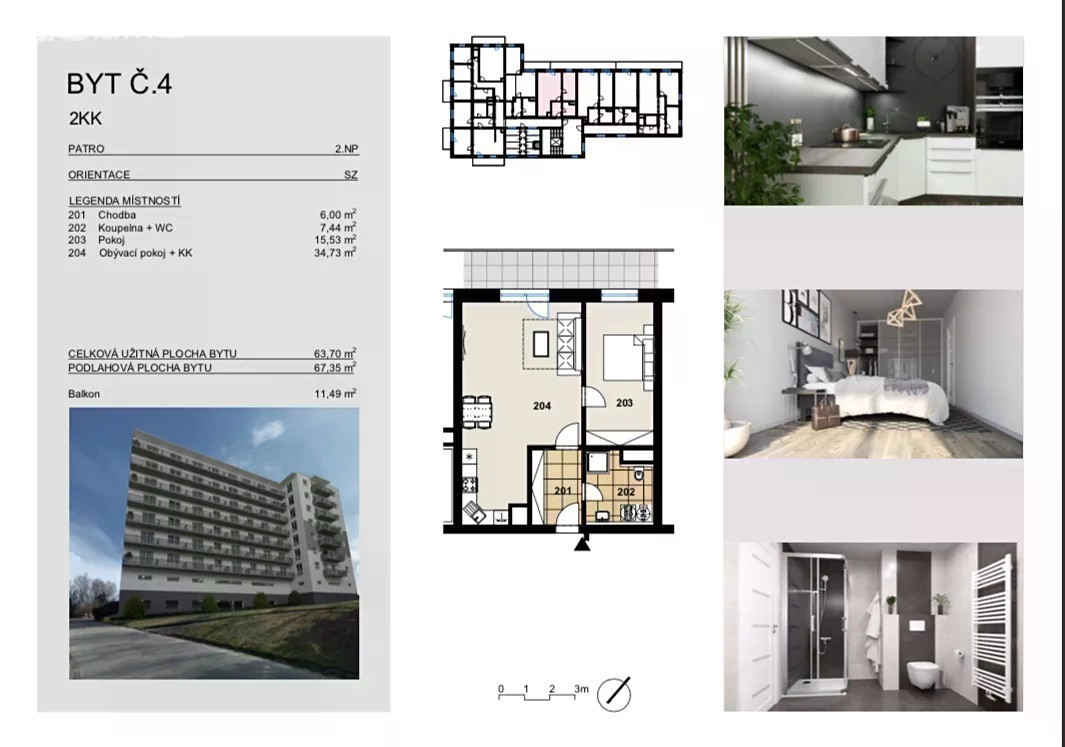 Nabízíme prodej nových a moderních bytových jednotek, a to v projektu na ulici Okružní, které jsou téměř luxusní svoji velikostí a technologiemi. Bytový dům nabízí jak bytové jednotky od dispozic 1+kk po 4+kk, tak i nebytové prostory v 1.NP. Tato konkrétní bytová jednotka o dispozici 2+kk, se nachází ve 4.np/8np. nově zbudovaného bytového domu s výtahem a je v projektu označena jako jednotka 3.B4 Plocha tohoto bytu činí 67,35 m2, dále k němu náleží příslušenství, jakožto 1 balkón (11,49 m2) a sklepní prostor přímo na patře o výměře 2,65 m2. Společným rysem všech bytů je plocha nadstandardních rozměrů, praktické dispoziční řešení, kvalitní vinylové podlahy, rekuperační jednotky na údržbu čistého, svěžího vzduchu v bytech a jiné velkorysé zařizovací předměty či podlahové teplovodní vytápění. Byly vybrány technologické prvky a materiál tak, abychom potřeby zákazníka vedli k maximální spokojenosti. K bytu je možno dokoupit 1 venkovní parkovací stání. Projekt je aktuálně těsně před kompletním dokončením. K nastěhování podzim 2025 Výhodou je také lokalita, která nabízí veškeré poptávané služby a vybavenost včetně skvělé dojezdnosti díky dálnici D1. Pro účely tohoto projektu vám rádi zajistíme financování pomocí zvýhodněného hypotečního úvěru. Pro více informací o projektu kontaktujte makléře.
