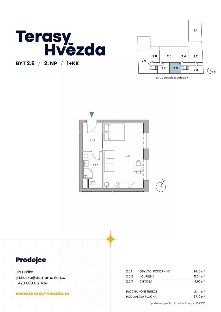 POSLEDNÍ VOLNÝ BYT 1+KK V PROJEKTU TERASY HVĚZDA Sen o bydlení na břehu řeky se vám teď může splnit. V rezidenci Terasy Hvězda, která právě vyrůstá na začátku městské části Brno-Bystrc, na vás čekají krásné nové byty o dispozici 1+kk různých výměr, které jsou ideální jako startovací bydlení, bydlení pro jednotlivce nebo byty na investici. Novostavba rezidence představuje ideální místo pro ty, kdo hledají kvalitní a moderní bydlení. Díky možnosti klientských změn můžete interiér plně přizpůsobit svým představám. Některé byty mají terasy. Poloha na ulici U Zoologické zahrady nabízí klid a blízkost přírody (řeka Svratka, přehrada, zoo, přírodní park Baba). Zároveň jste stále v dosahu veškeré občanské vybavenosti - v okolí najdete řadu obchodů, restaurací a služeb. Rezidence je také dobře dopravně dostupná, nedaleko leží několik zastávek MHD. Zakoupit si můžete také vlastní parkovací stání přímo v objektu. Pokud pořizujete nemovitost na investici, tento byt představuje výbornou příležitost pro uložení peněz, neboť malometrážních bytů je v Brně nedostatek, a jejich hodnota tak dobře poroste. Byty budou k nastěhování začátkem roku 2026. Pokud vás zajímá více informací a chcete si vybrat ten správný byt pro vás, zavolejte našemu makléři. Rád se vám bude věnovat.