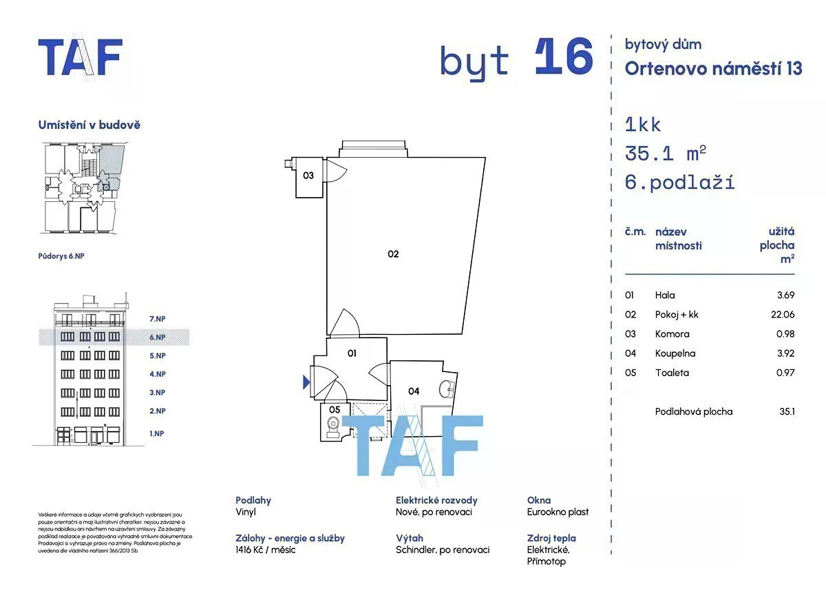 Citlivě zrekonstruovaný byt 1+kk s šatnou a samostatnou toaletou - Ortenovo náměstí 13, Praha 7 - Holešovice V exkluzivní nabídce představujeme byt 1+kk o podlahové ploše 35,1 m², který prošel kompletní a pečlivě provedenou rekonstrukcí s důrazem na kvalitu materiálů a řemeslné zpracování. Nachází se v bytovém domě na prestižní adrese Ortenovo náměstí 13 v srdci Holešovic, jen pár minut chůze od metra C - Nádraží Holešovice. Nadčasový interiér s charakterem Už při vstupu vás byt zaujme svou promyšlenou dispozicí a zpracováním: • Repasované dubové parkety byly odborně vybroušeny, přetmeleny, zbaveny nerovností a ošetřeny ekologickým lakem, který zvýrazňuje jejich přirozenou kresbu a dodává prostoru teplo a eleganci. • Zcela nová koupelna s designovými armaturami značky Hansgrohe, závěsným WC Vitra a podomítkovým systémem Geberit působí čistě a moderně. • Byt vyniká samostatnou toaletou - praktické řešení, které u bytů této velikosti nebývá samozřejmostí. • Šatna/komora tvoří oddělený prostor, který umožňuje ukládání sezónních věcí i každodenního oblečení bez narušení estetiky hlavního obytného prostoru. • V předsíni byla položena kvalitní vinylová podlaha, která spojuje vysokou odolnost s elegantním vzhledem. Klidná lokalita v pulzujícím městském prostředí Ortenovo náměstí nabízí to nejlepší z městského života - obchody, kavárny, restaurace, parky i vynikající dopravní dostupnost. Tramvajová zastávka je doslova za rohem a stanice metra Nádraží Holešovice vzdálená jen několik minut chůze. Proč tento byt? • Ideální startovní bydlení, pied-à-terre nebo investiční příležitost • Precizně zrekonstruovaný prostor bez dalších investic • Klidné a kultivované prostředí v modernizovaném domě