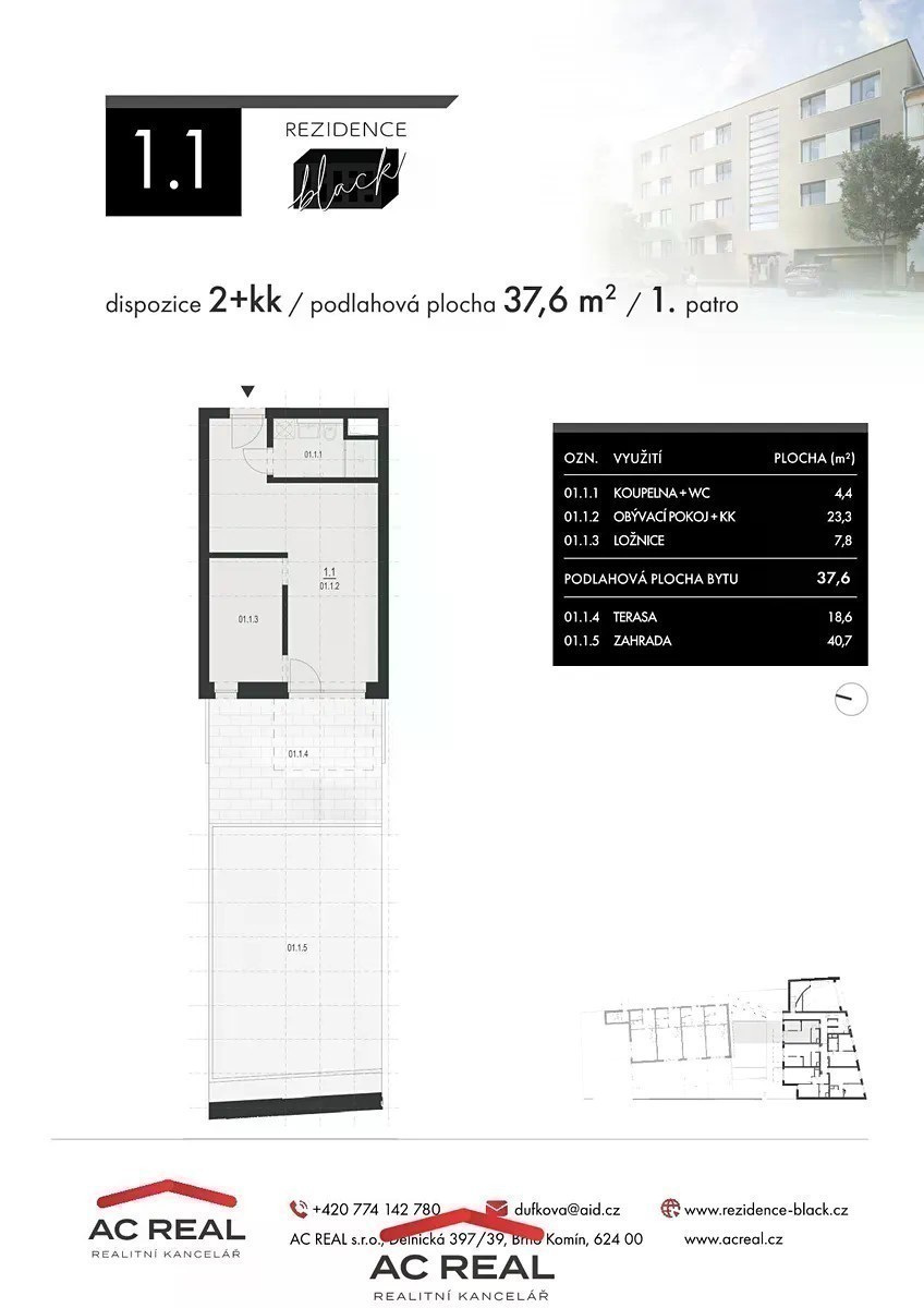 Hledáte moderní bydlení pro dva se zahradou blízko centra Brna? Byt o dispozici 2+kk a celkové ploše 37,6 m2 v připravované novostavbě Rezidence Black na ulici Charbulova v Brně - Černovicích nabízí praktické dispoziční rozvržení, jehož součástí je i prostorná terasa (18,6 m2) a vlastní zahrada (40,7 m2) s orientací na západ - do klidného vnitrobloku. Po vstupu do bytu se ocitáme v otevřeném obytném prostoru zahrnujícím obývací pokoj, kuchyňský a jídelní kout. Odtud pak vedou samostatné dveře do dalších částí bytu, konkrétně do ložnice a do moderně zařízené koupelny se sprchovým koutem. Z obývacího pokoje můžeme vyjít přímo na zahradu s prostornou terasou, ideální pro relaxaci nebo grilování s přáteli. Byt je vybaven ve velmi vysokém standardu: - vlastní rekuperační jednotka - předokenní žaluzie - podlahové vytápění ve všech místnostech - velkoformátové obklady a dlažba v koupelně - zařizovací předměty světových značek jako je Villeroy & Boch nebo Hans Grohe - SPC podlahy v obytných místnostech - hladké sádrové omítky v celém interiéru bytu - antracitové dveře o výšce 2100 mm Tento byt může být i skvělou investicí. Atraktivní lokalita Brno - Černovice je dynamicky se rozvíjející oblast s veškerou občanskou vybaveností a dobrou dostupností jak do centra města, tak i na dálnice D1 a D2. Byt je navržen s důrazem na kvalitu a moderní design, což taktéž zajišťuje dlouhodobou hodnotu Vaší investice. Po podpisu Smlouvy o smlouvě budoucí kupní navíc hradíte první část kupní ceny ve výši 10 % a zbytek až po kolaudaci. Součástí domu jsou parkovací stání a sklepní kóje. Termín kolaudace domu 9/2026. Rádi Vám celý projekt představíme osobně, neváhejte nás kontaktovat!
