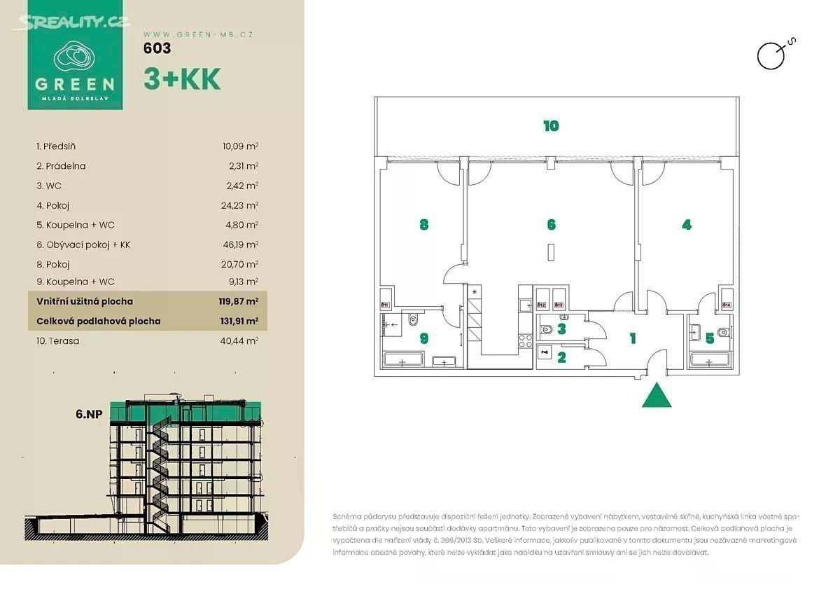 Velkoryse řešený penthouse s prostornou terasou o dispozici 3+kk a celkové podlahové ploše 131,91 m² v nejvyšším, 6. nadzemním podlaží, je součástí moderního rezidenčního projektu Green Mladá Boleslav. Projekt vzniká v atraktivní části Mladé Boleslavi, v těsné blízkosti golfového hřiště a zeleně, přesto však s výborným spojením do centra města. Dokončení a k nastěhování již jaro/léto 2026. Interiér tvoří prostorný obývací pokoj s přípravou na kuchyňskou linku, dvě ložnice s vlastní koupelnou, samostatná toaleta, prádelna a vstupní chodba. Z každého pokoje je přímý vstup na rozlehlou západně orientovanou terasu o ploše 40,44 m², která nabízí příjemné venkovní posezení s panoramatickým výhledem.Díky vysokému standardu zpracování, podlahovému vytápění i chlazení a energetické třídě „A“ nabízí byt komfortní a zároveň úsporné bydlení. Objekt využívá moderní tepelná čerpadla, která přispívají k nízkým provozním nákladům.Součástí areálu je privátní komunitní zahrada vhodná k relaxaci či letnímu grilování, rozsáhlé parkovací možnosti včetně dobíjení elektromobilů a kompletní občanská vybavenost v pěší dostupnosti. Za příplatek garážové, nebo venkovní parkovací stání. Green Mladá Boleslav se nachází jen 5 minut jízdy od centra Mladé Boleslavi a zároveň poskytuje klidné prostředí obklopené přírodou. Projekt je situován v klidné části města s přímým napojením na zeleň a volnočasové aktivity. Bydlení v bezprostřední blízkosti golfových jamek osmnácti jamkového prestižního golfového hřiště přináší rezidentům široké možnosti pro trávení času s rodinou či přáteli. Pro více informací o jednotkách, cenách a dostupnosti kontaktujte naši kancelář, nebo navštivte oficiální webové stránky projektu GREEN-MB.
