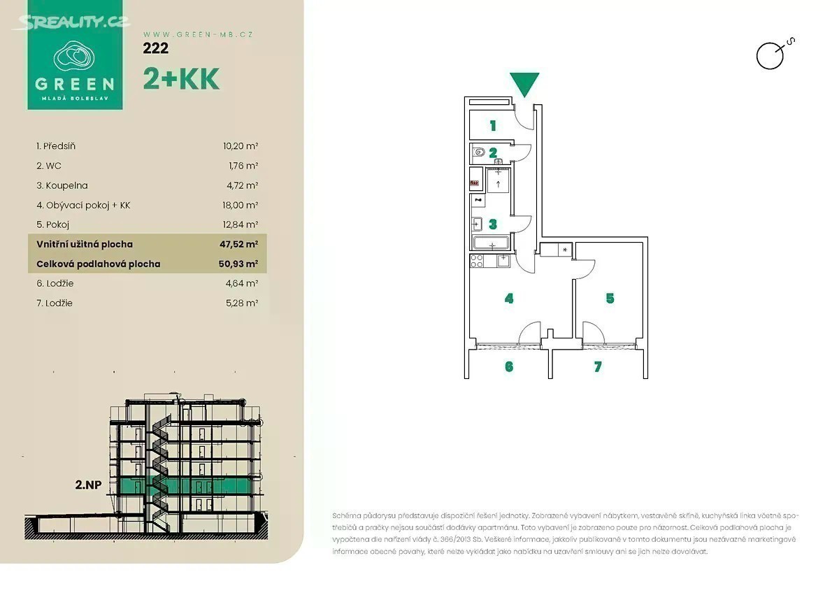 Světlý byt s prostornou lodžií o dispozici 2+kk a podlahové ploše 50,93 m² je součástí moderního rezidenčního projektu Green Mladá Boleslav. Projekt vzniká v atraktivní části Mladé Boleslavi, v těsné blízkosti golfového hřiště a zeleně, přesto však s výborným spojením do centra města. Dokončení a k nastěhování již jaro/léto 2026. Dispozičně je byt rozdělen na prostorný obývací pokoj s přípravou na kuchyňskou linku, samostatnou ložnici, předsíň, koupelnu, samostatné WC a praktickou komoru. Z obou pokojů je přímý vstup na jihozápadně orientovanou lodžii, která nabízí příjemný venkovní prostor k posezení či relaxaci.Díky vysokému standardu zpracování, podlahovému vytápění i chlazení a energetické třídě „A“ nabízí byt komfortní a zároveň úsporné bydlení. Objekt využívá moderní tepelná čerpadla, která přispívají k nízkým provozním nákladům.Součástí areálu je privátní komunitní zahrada vhodná k relaxaci či letnímu grilování, rozsáhlé parkovací možnosti včetně dobíjení elektromobilů a kompletní občanská vybavenost v pěší dostupnosti. Za příplatek garážové, nebo venkovní parkovací stání. Green Mladá Boleslav se nachází jen 5 minut jízdy od centra Mladé Boleslavi a zároveň poskytuje klidné prostředí obklopené přírodou. Projekt je situován v klidné části města s přímým napojením na zeleň a volnočasové aktivity. Bydlení v bezprostřední blízkosti golfových jamek osmnácti jamkového prestižního golfového hřiště přináší rezidentům široké možnosti pro trávení času s rodinou či přáteli. Pro více informací o jednotkách, cenách a dostupnosti kontaktujte naši kancelář, nebo navštivte oficiální webové stránky projektu GREEN-MB.