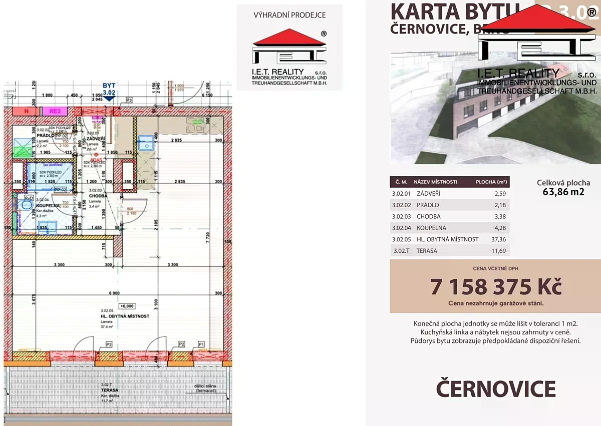 Nabízíme k prodeji nový byt s označením 3.02 o dispozici 2+kk v právě vznikajícím projektu Bytový dům Faměrovo náměstí v Brně. Byt o celkové výměře 63,86 m² se nachází v moderní novostavbě s důrazem na kvalitní provedení, funkční dispozice a moderní městské bydlení. Nabízí kromě promyšlené vnitřní dispozice i prostornou terasu o výměře 11,69 m², ideální pro ranní kávu, večerní relax nebo městskou zeleň v soukromí. K bytu dále náleží jedno parkovací místo v 1.NP za cenu 583.275,- Kč, které není zahrnuto v kupní ceně. Termín dokončení projektu 12/2026 Interiér bytu je navržen v nadčasovém stylu s příjemnými přírodními tóny. Podlahy obytných místností pokrývá vinyl v dekoru dubového dřeva, koupelna a WC jsou obloženy keramickou dlažbou v decentních odstínech šedé s designem betonu. Koupelna je vybavena sprchovým koutem s bezpečnostním sklem, závěsným WC systémem Geberit a moderní černou sanitou značky Nobless. Vstupní dveře jsou bezpečnostní, protipožární, v antracitovém provedení, vnitřní dveře bílé s lakovaným povrchem. Byt má připravené vývody pro kuchyňskou linku (elektřina, voda, kanalizace), centrální vytápění s vlastním měřením a přípravu pro internet a domácí telefon. Zveřejněné fotografie jsou pouze ilustrativní pro představu klienta, jak by se mohl byt vybavit. Samotný dům je navržen jako moderní betonová stavba s kvalitní fasádou a extenzivní zelenou střechou. Společné prostory jsou provedeny ve vysokém standardu - keramická dlažba, sádrové omítky, osvětlení na pohybová čidla, kolárna, technická místnost a samostatně řešená místnost pro odpad přímo v domě. V rámci projektu jsou k dispozici také garážová stání s dálkovým ovládáním. Lokalita nabízí klidné městské bydlení s výbornou dopravní dostupností a kompletní občanskou vybaveností v bezprostředním okolí. Projekt je vhodný pro vlastní bydlení i jako výhodná investice.