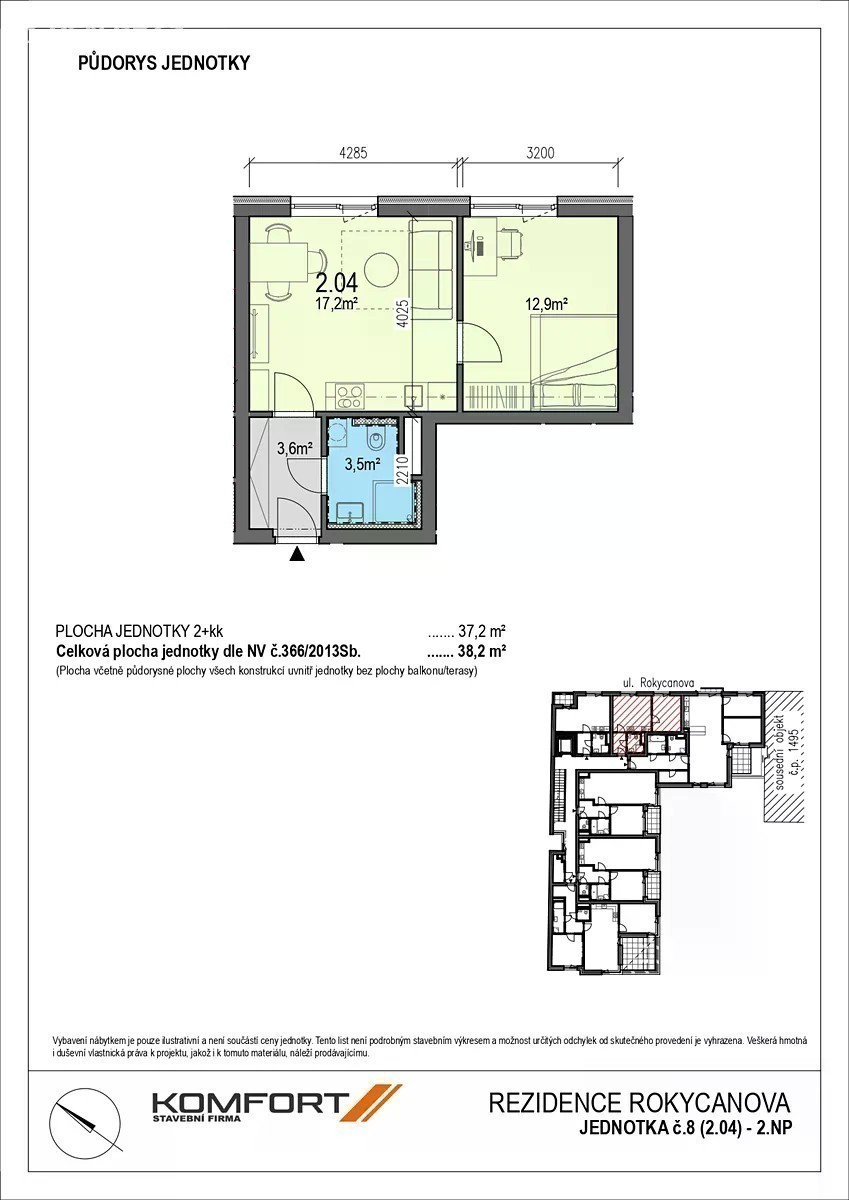 Nabízíme k prodeji byt kategorie 2+kk o velikosti 37,2 m2 v novostavbě domu na ulici Rokycanova v městské části Brno - Židenice. Dům bude mít pět nadzemních a jedno podzemní podlaží. V domě bude umístěno 26 jednotek k bydlení o velikosti 1+kk až 4+kk a 25 garážových stání a 22 sklepů.