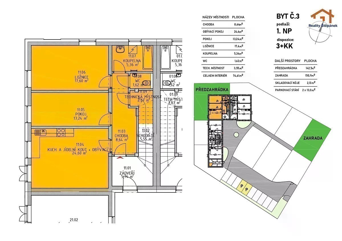 Nabízíme k prodeji podkrovní byt 3+kk se zahradou v novostavbě v Kojákovicích Bytová jednotka č. 4 s dispozicí 3+kk o užitné ploše 77,7 m² se nachází ve 2. NP novostavby bytového domu v malebné obci Kojákovice nedaleko Třeboně. K bytu je možné užívat soukromou zahradu o ploše 136 m², která je součástí oploceného areálu. V ceně je zahrnuta skladovací kóje a parkovací stání na pozemku. Součástí standardního vybavení bytu jsou vinylové podlahy v dekoru dub, obložkové zárubně a dveře v provedení CPL se zvýšenou odolností, koupelna kompletně zařízená v Senesi s možností výběru ze dvou designových variant (dřevodekor nebo béžová). Topení a ohřev vody zajišťuje tepelné čerpadlo ve spojení s podlahovým vytápěním, všechny byty jsou navíc doplněné o rekuperaci pro maximální energetickou úsporu. Objekt dosahuje energetické náročnosti třídy B - velmi úsporná. V projektu je prostor pro širokou škálu klientských změn a přizpůsobení bydlení na míru. Bytový dům se nachází na okraji obce, v klidné lokalitě s výhledem na obecní rybník, v zástavbě rodinných domů. Fasáda je provedena v tradičním stylu Třeboňska, v kombinaci bílé a světle okrové barvy se střechou z cihlově červené pálené krytiny. Celý areál je oplocený a nepřístupný veřejnosti. Při rezervaci je splatných pouze 10% z kupní ceny a zbývající část až před předáním, za bydlení tedy platíte až ve chvíli, kdy jej můžete skutečně užívat. Zahájení stavby a předprodej: Q2 2025 Kolaudace a předání: Q4 2026 Pro více informací a možnost osobní konzultace nás neváhejte kontaktovat. Rádi Vám projekt blíže představíme a umožníme prohlídku na stavbě. Detailní informace naleznete na stránkách společnosti Fine Flats s.r.o.