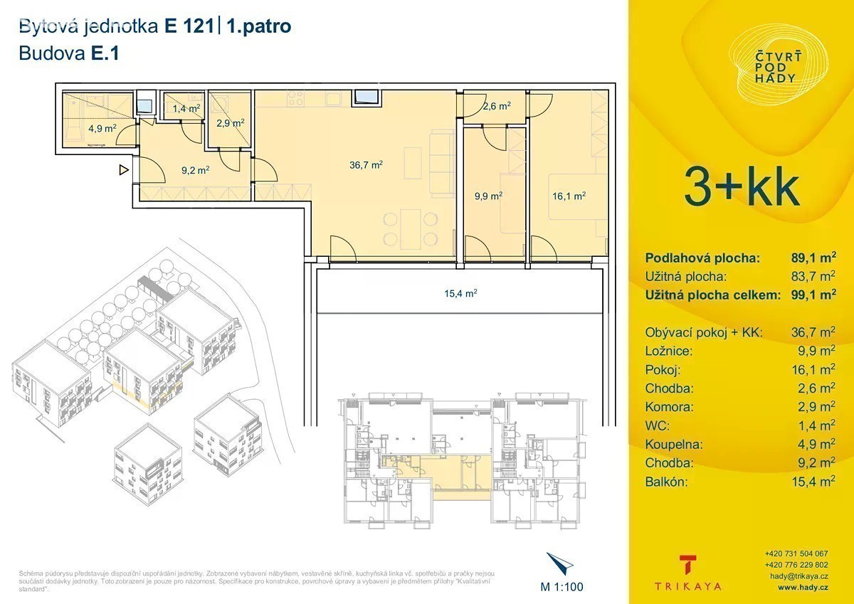 Bydlete v zelenomodré Čtvrti Pod Hády s vlastní vybudovanou občanskou vybaveností. Centrem a srdcem čtvrti bude náměstí navržené jako místo pro trhy, kulturní a společenské akce. Kolem se budou nacházet komerční prostory určené pro obchody a služby. 1. etapa Čtvrti Pod Hády nabízí atraktivní mix bydlení: bytové domy kolem náměstí, komornější vila domy, či výškový dům s výhledy na celé Brno. Vybírat si můžete od jednopokojových po čtyřpokojové byty, přičemž ke každému bytu náleží balkon, lodžie nebo terasa s vlastní zahradou. Nabízíme k prodeji moderní byt 3+kk č. E 121 v cihlové novostavbě situovaný v atraktivní lokalitě města Brna. Tento jednopodlažní byt s užitnou plochou 99,1 m² se nachází v prvním patře a disponuje prostorným balkonem o velikosti 15,4 m², který poskytuje příjemný výhled a ideální místo k odpočinku. Byt je v osobním vlastnictví, což zajišťuje plnou kontrolu nad vaším novým bydlením. Novostavba je navržena s důrazem na moderní technologie a estetiku, splňující nároky na komfortní a kvalitní bydlení. Vysoký standard zpracování a použití kvalitních materiálů zajistí dlouhou životnost a minimální údržbu. Technické parametry projektu: Nosné konstrukce a obvodové zdivo - železobetonové stěny (tl. 300 mm) a vápenopískové velkoformátové tvárnice (tl. 240 mm) Tepelná izolace - desky z minerální vlny (tl. 200 mm a 180 mm) Okna - izolační trojsklo s celoobvodovým kováním, otevíravě sklopná Vytápění: Teplovodní Projekt nevzniká na zelené louce, ale vyrůstá na ploše revitalizovaného brownfieldu po nikdy nezprovozněné továrně Ergon a recykluje část materiálů z demolice areálu. Ekologičnost projektu vyniká především zelenými střechami osazenými fotovoltaickými panely, inovativním systémem na udržení vody v krajině díky retenčním nádržím, včetně pečlivého výběru suchomilné zeleně s minimálními nároky na spotřebu vody. Tato nemovitost je ideální volbou pro ty, kteří hledají klidné bydlení s výbornou dostupností do centra města a veškerou občanskou vybaveností v dosahu. Čtvrť Pod Hády je situována v městské části Brno - Maloměřice a Obřany. Je dostupná autem z ulice Jedovnická a městskou hromadnou dopravou ze zastávky Zimní. Velkou výhodou je napojení lokality na Velký městský okruh, které zaručí snadné dojíždění. Nejbližší okolí nabízí hustou síť turistických tras, cyklotras a oblíbené horolezecké terény v Moravském krasu. Pokud Vás byt zaujal, neváhejte nám napsat nebo zavolat a domluvit si tak osobní schůzku.